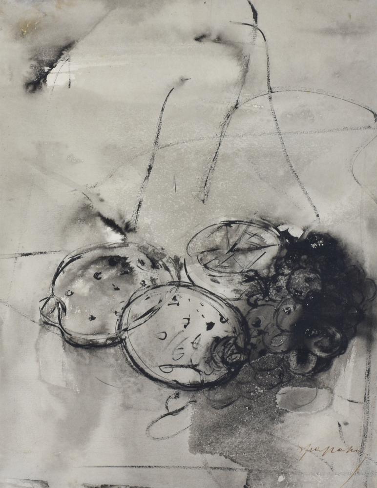 Luigi Spazzapan NATURA MORTA DI FRUTTA tecnica mista su carta, cm 39,5x30,5 sul fronte: firma Già collezione prof.Luigi Carluccio L'opera presenta uno strappo in alto a sinistra