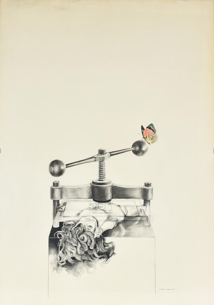 Silvana Siccari FARFALLA, TORNIO E BAMBOLA tecnica mista su carta, cm 100x70 sul fronte: firma e data eseguita nel 1976