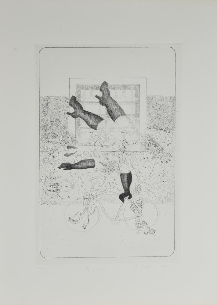 Claudio Knopfli BY-CYCLUS acquaforte su carta, cm 70x50 (lastra cm 49x32) esemplare 27 su 30 sul fronte: firma, titolo e data eseguita nel 1974