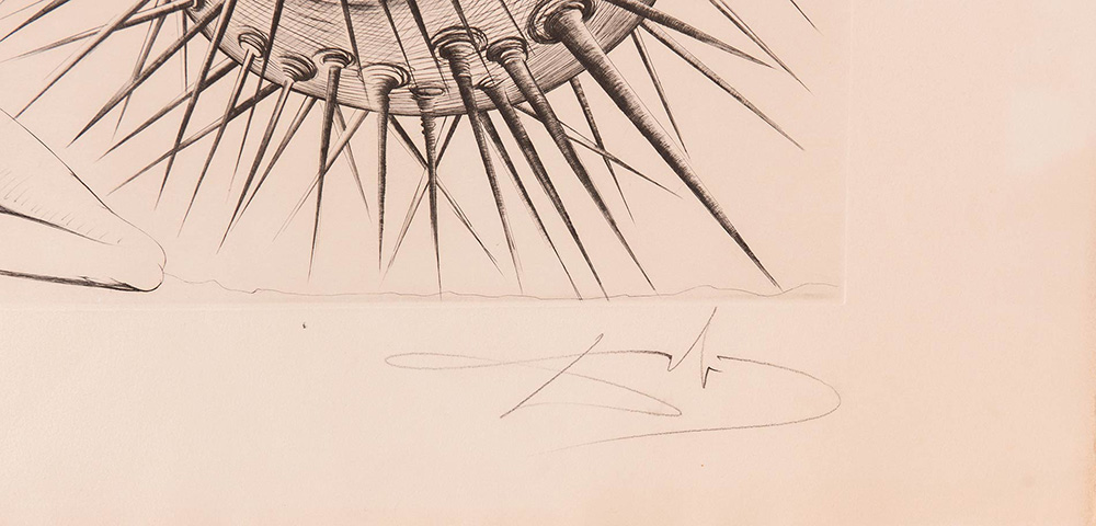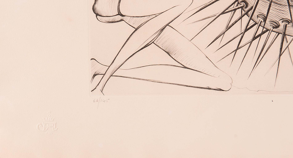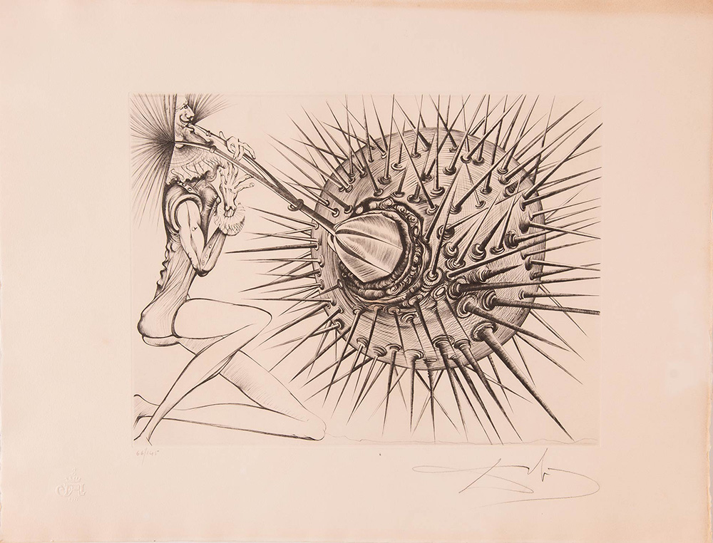 Salvador Dalì ( Figueres 1904 – Figueres 1989), “Don Quichotte et l’oursin”, 1971. Acquaforte su carta, firmata in basso a destra Dalì, numero di tiratura in basso a sinistra 66/145, carta Grand Vélin d’Arches, timbro a secco in basso a sinistra, Foglio H cm 50x65.5 Opera accompagnata da Certificato di Autenticità Edition d’Art Les Heures Claires – Paris.