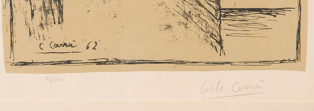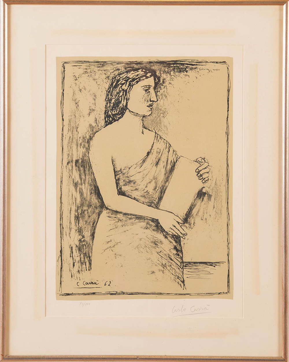 Carlo Carrà (Quargnento 1881 – Milano 1966), “Donna con libro”, 1962. Litografia su carta, firmata in basso a destra Carrà, numero di tiratura in basso a sinistra 73/100, Lastra H cm 42.5x31