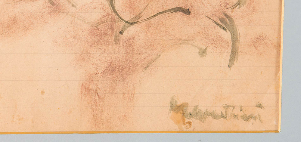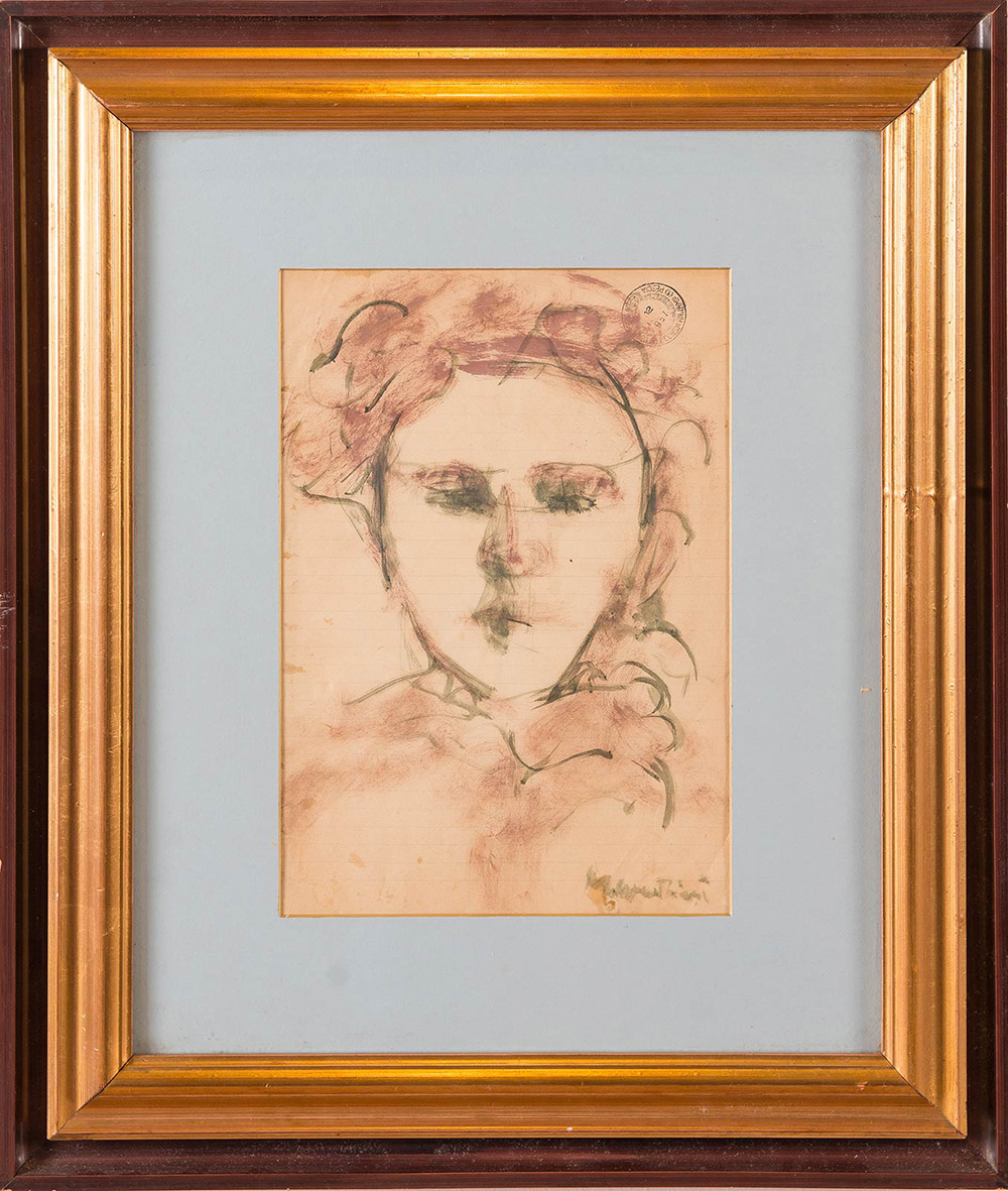Arturo Martini (Treviso 1889 – Milano 1947), “Volto femminile”. Acquerello su carta, firmato in basso a destra Martini, H cm 30.5x21 Reca in alto a destra timbro ‘Uff. registro e Cons.ria RR. Imm.ri (1) Pescia – 12 957’.