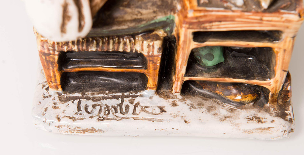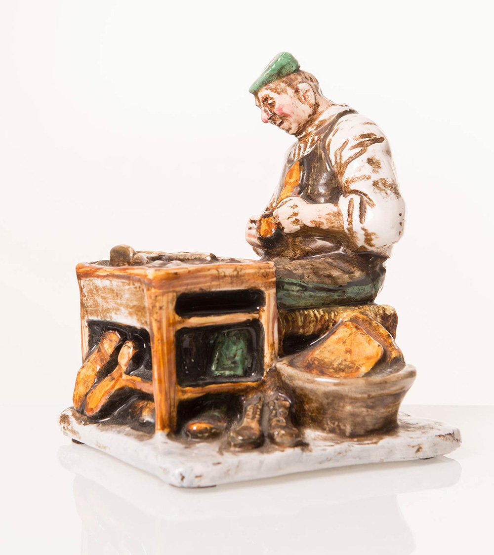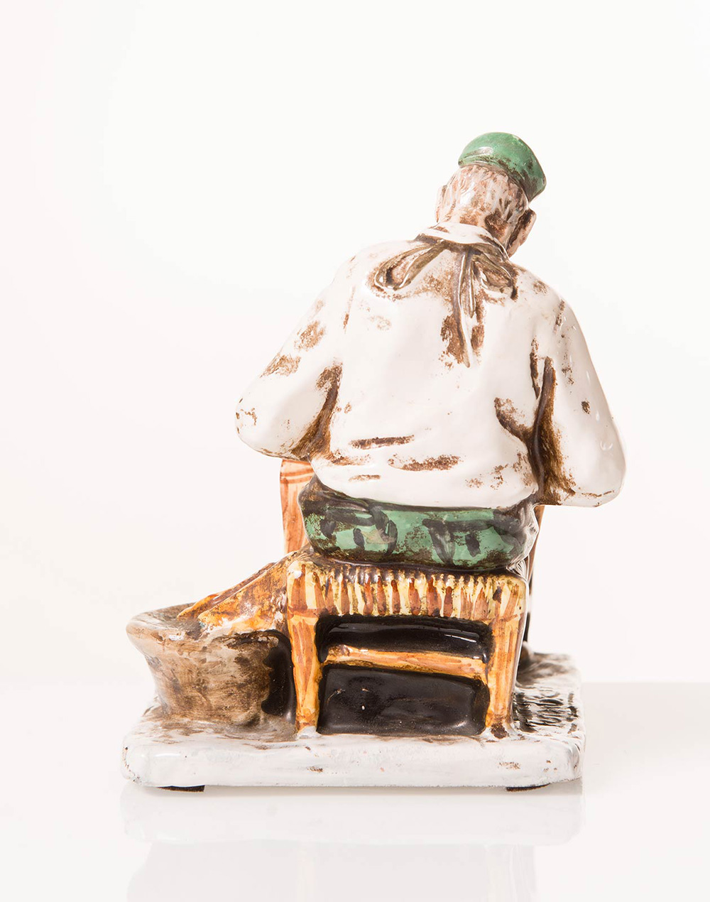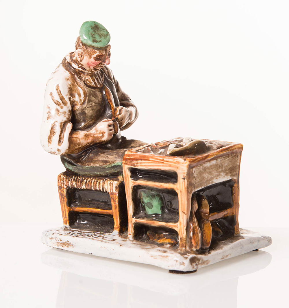Cleto Tomba (Castel San Pietro 1898 - Bologna 1987), “Calzolaio”, Manifattura Minghetti. Scultura in ceramica smaltata, firmata alla base Tomba, reca Marchio A Minghetti Bologna Italy sotto la base, H cm 16x11.5x13