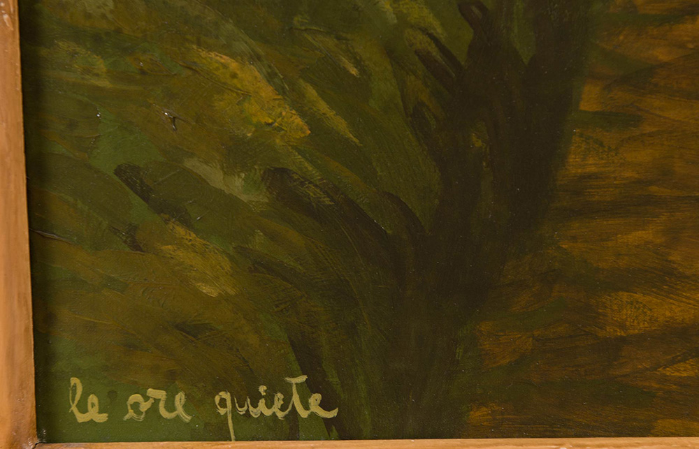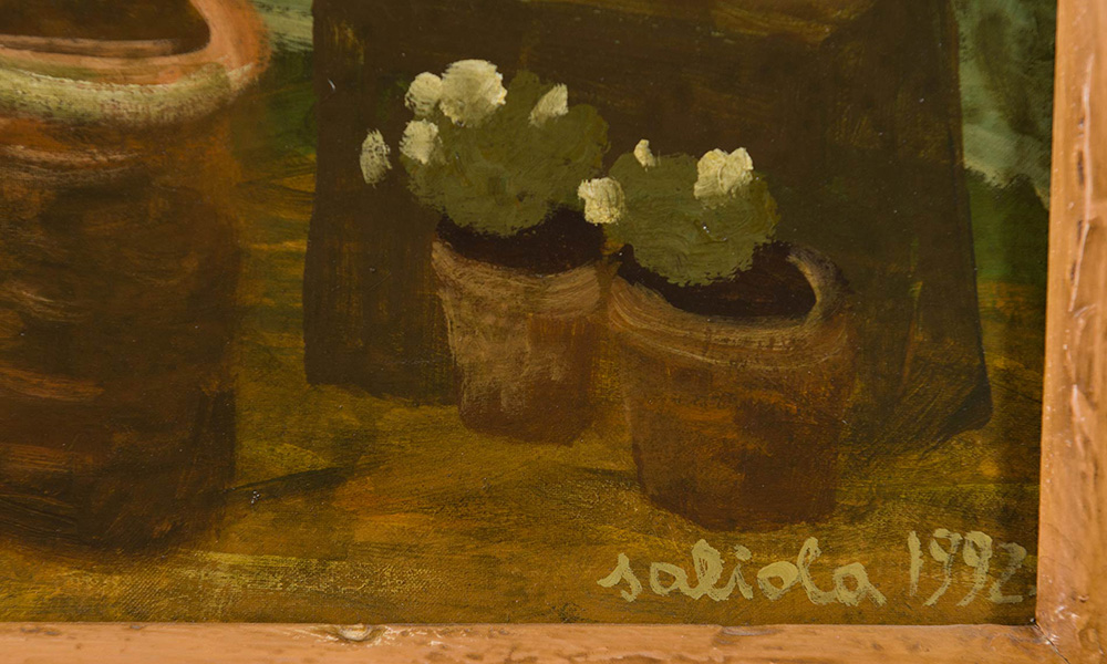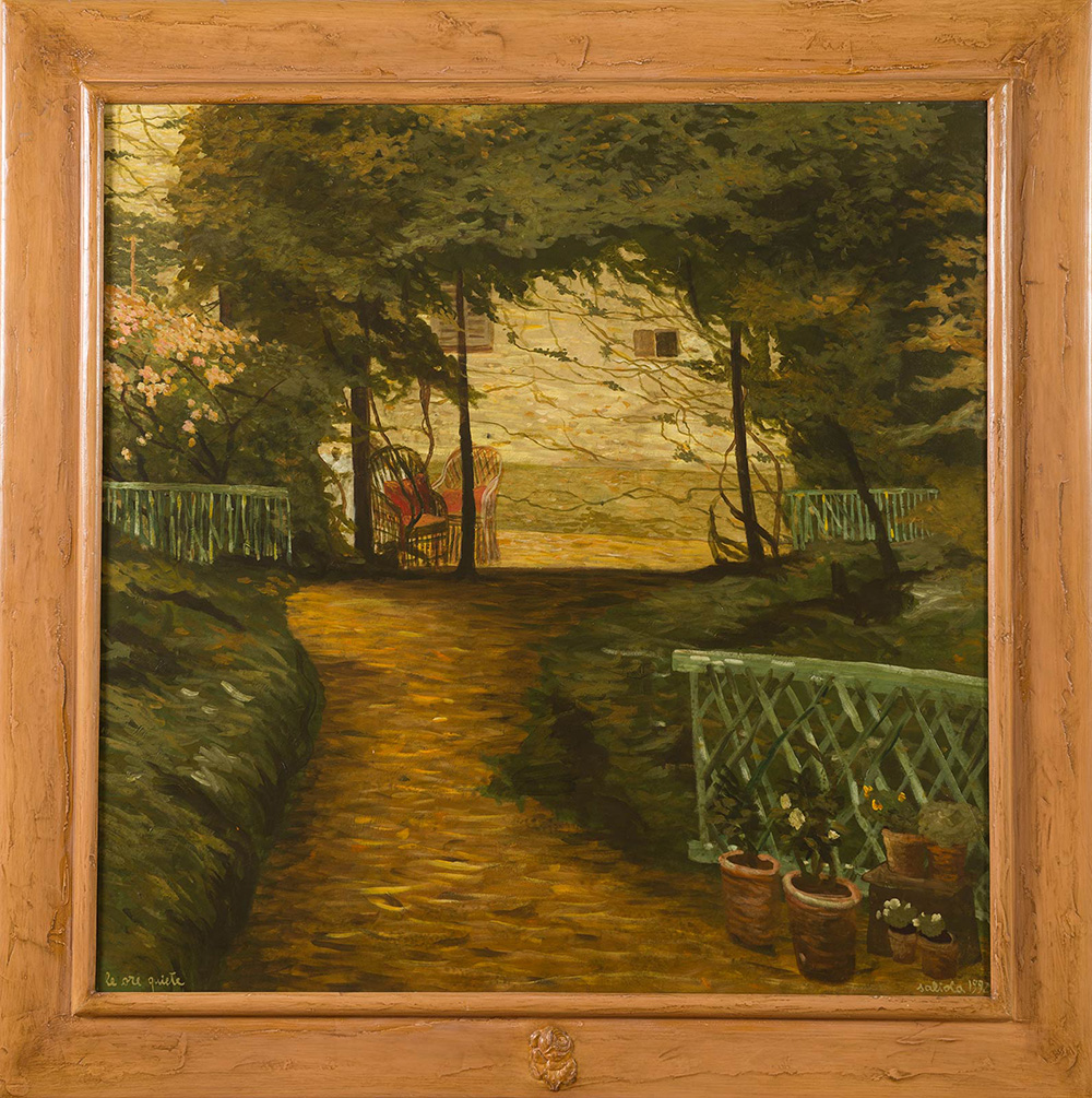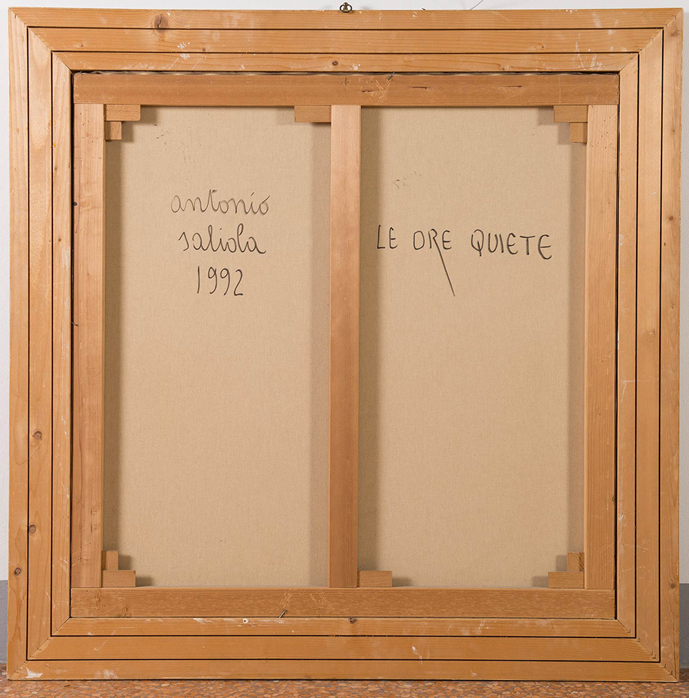 Antonio Saliola (Bologna 1939), “Le ore quiete”, 1992. Olio su tela, firmato e datato in basso a destra Saliola 1992, titolato in basso a sinistra ‘Le ore quiete’, al retro reca firma e titolo ‘Antonio Saliola 1992 – Le ore quiete’, H cm 100x100