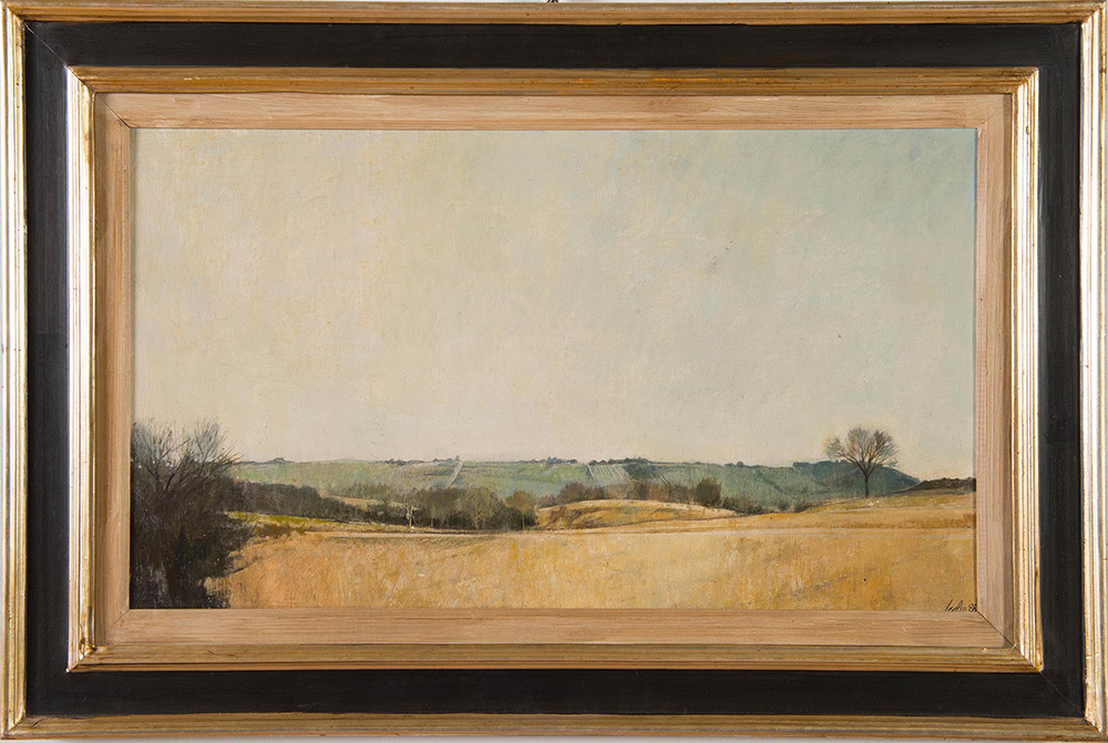 Giorgio Scalco (Schio 1929), “Terre gialle”, 1988. Olio su tela, firmato e datato in basso a destra Scalco 88, opera titolata, firmata e titolata al retro ‘Terre Gialle – Scalco 88’, H cm 40x70