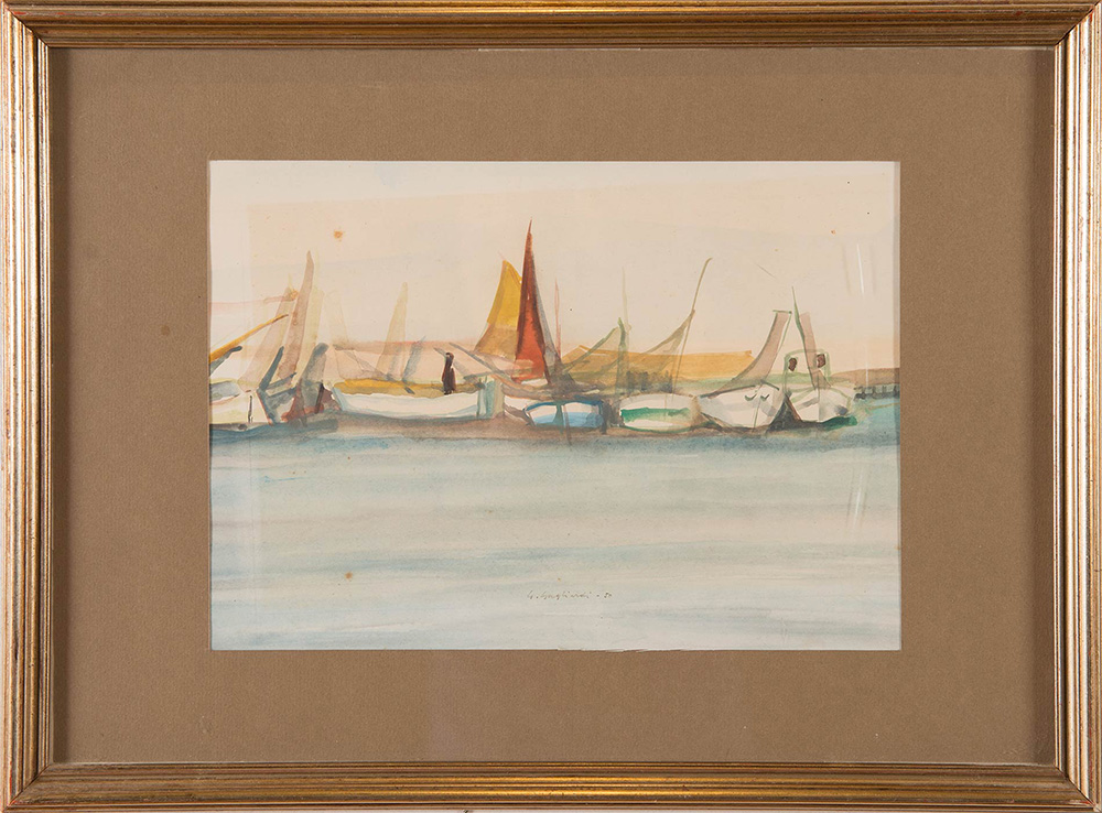 Giuseppe Gagliardi (Bologna 1902 – 2005), “Barche in porto”, 1950. Acquerello su carta, firmato e datato in basso al centro G. Gagliardi 50, H cm 22x31.5