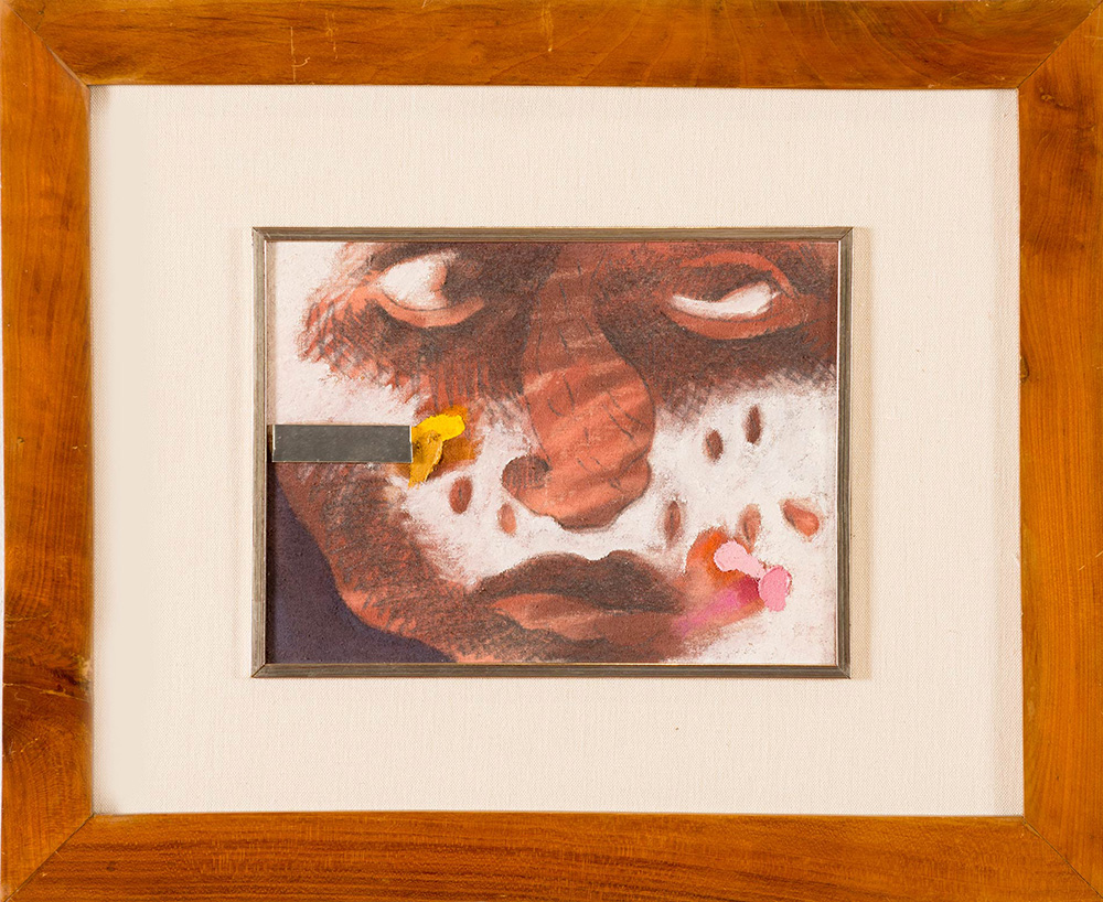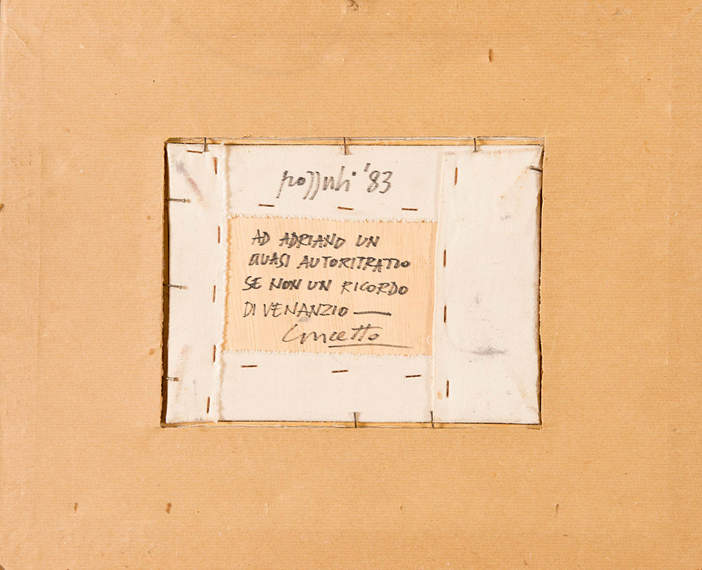 Concetto Pozzati (Vo' 1935 – Bologna 2017), “Senza titolo”, 1983. Olio e tecnica mista su tela applicata su tavola, firmato e datato al retro Pozzati 83, al retro presenta dedica, H cm 18x24
