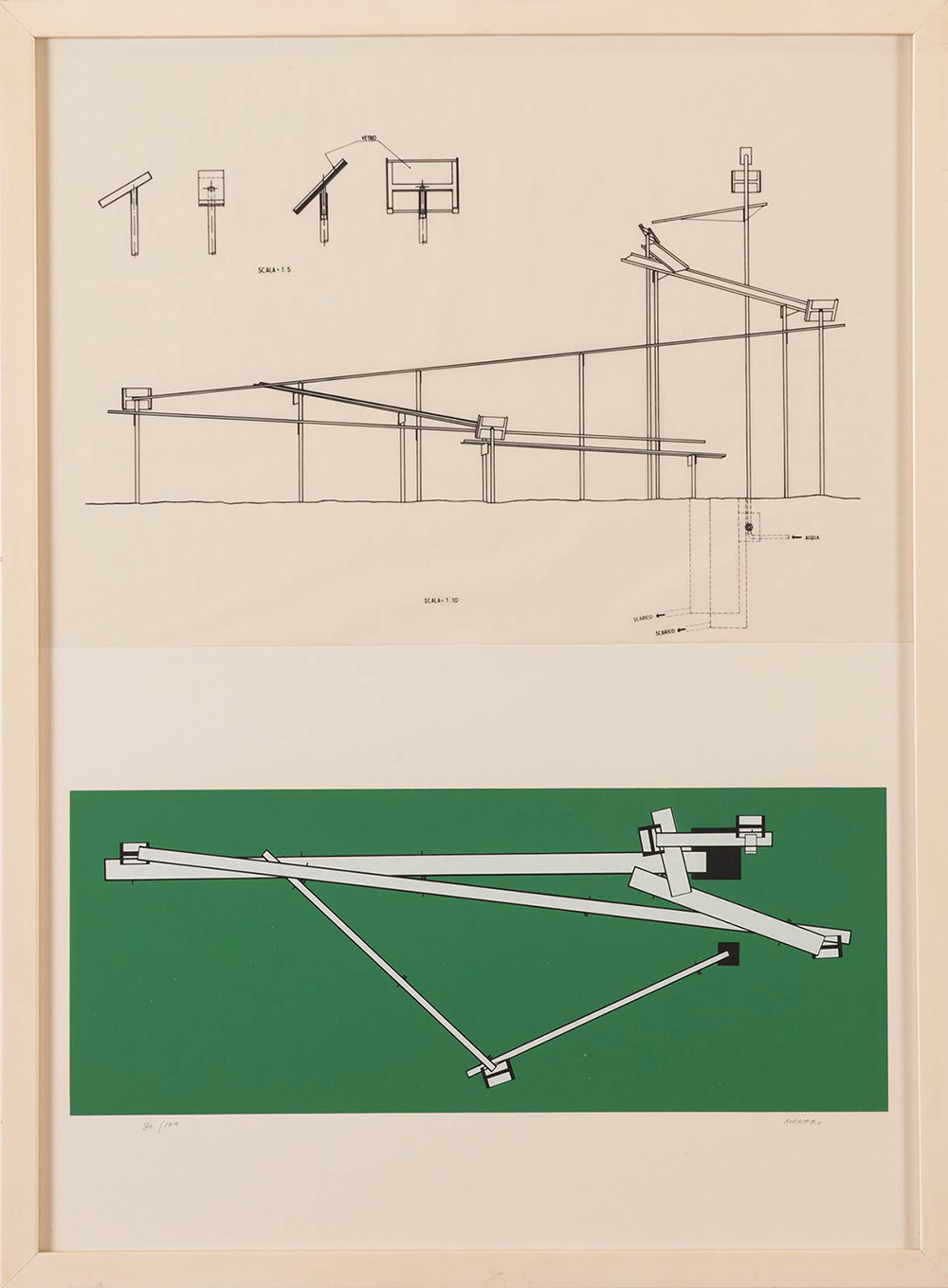 Bruno Munari (Milano1907 – 1998), Lotto composto da una litografia e una stampa. Litografia su carta raffigurante “Progetto per biennale Venezia”, 1954, firmata in basso a destra Munari, numero di tiratura in basso a sinistra 80/100, H cm 33x48. Stampa raffigurante “Progetto”, H cm 48x32.5