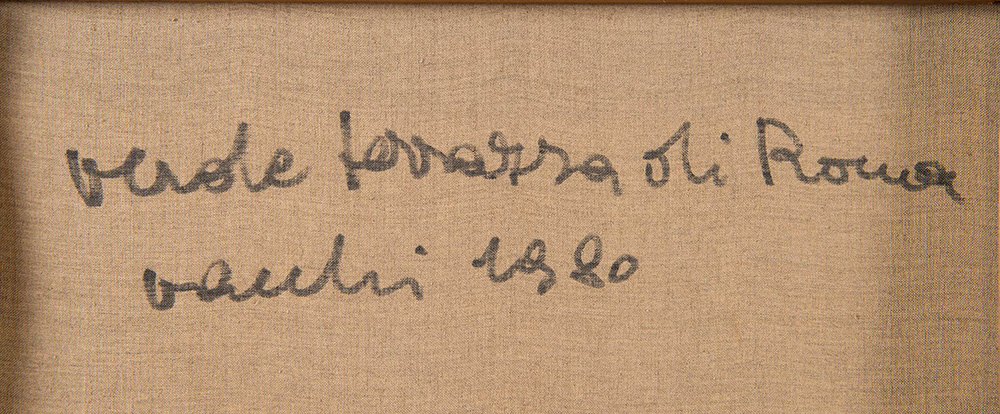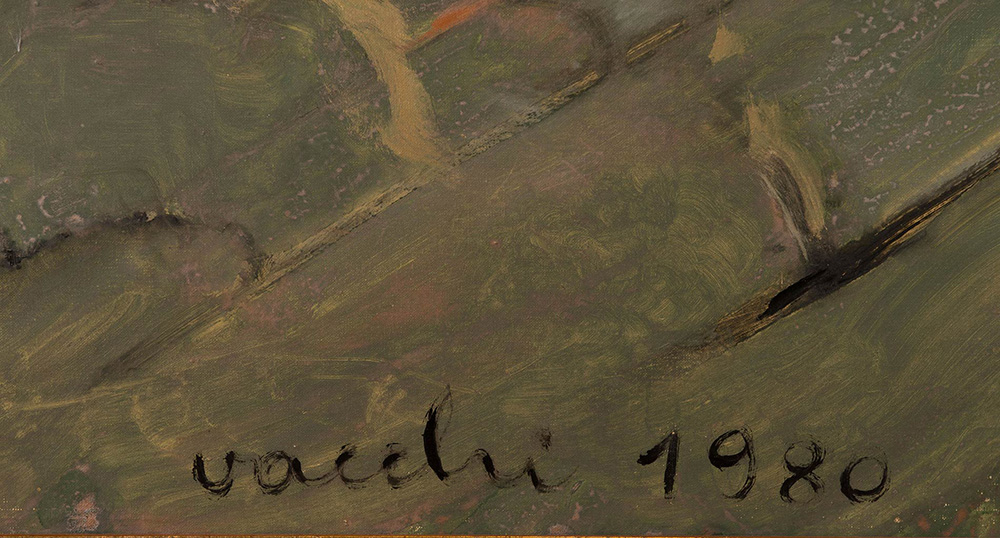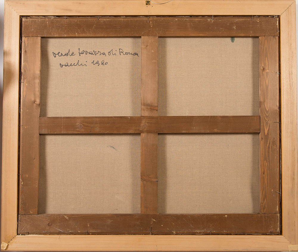 Sergio Vacchi (Castenaso 1925 – Siena 2016), “Verde terrazza di Roma”, 1980. Olio su tela, firmato e datato in basso al centro Vacchi 1980, al retro reca titolo, firma e data ‘Verde terrazza di Roma – Vacchi 1980’, H cm 100x120 Bibliografia: Opera pubblicata in 'Sergio Vacchi – Catalogo ragionato dei dipinti – 1948/2008' – a cura di Enrico Crispolti, Ed. Skira, Tomo III, p. 1142-1143, n.12/1980/45.