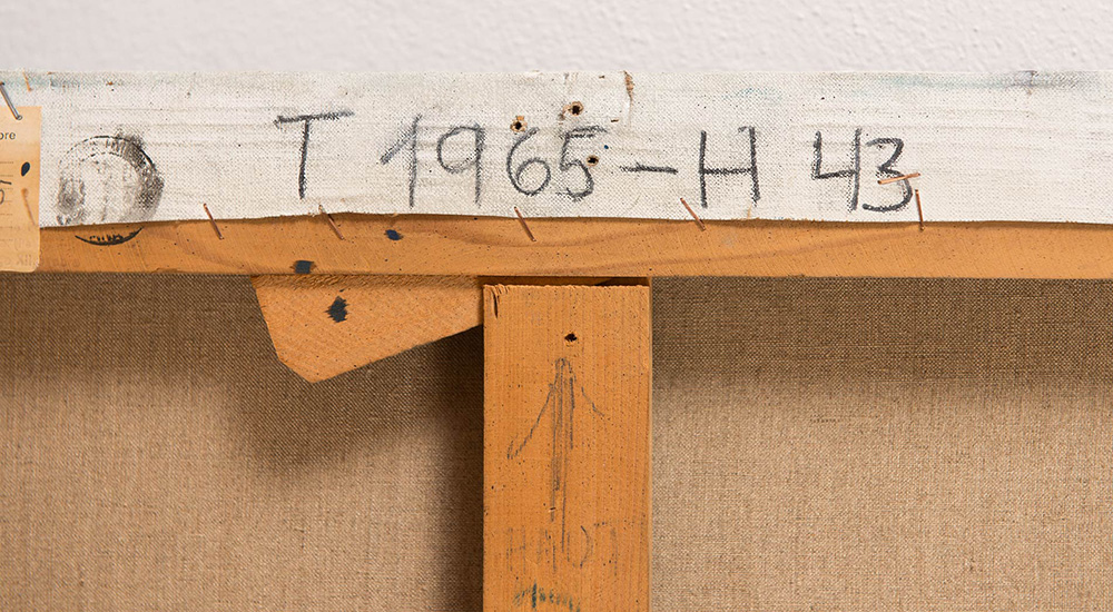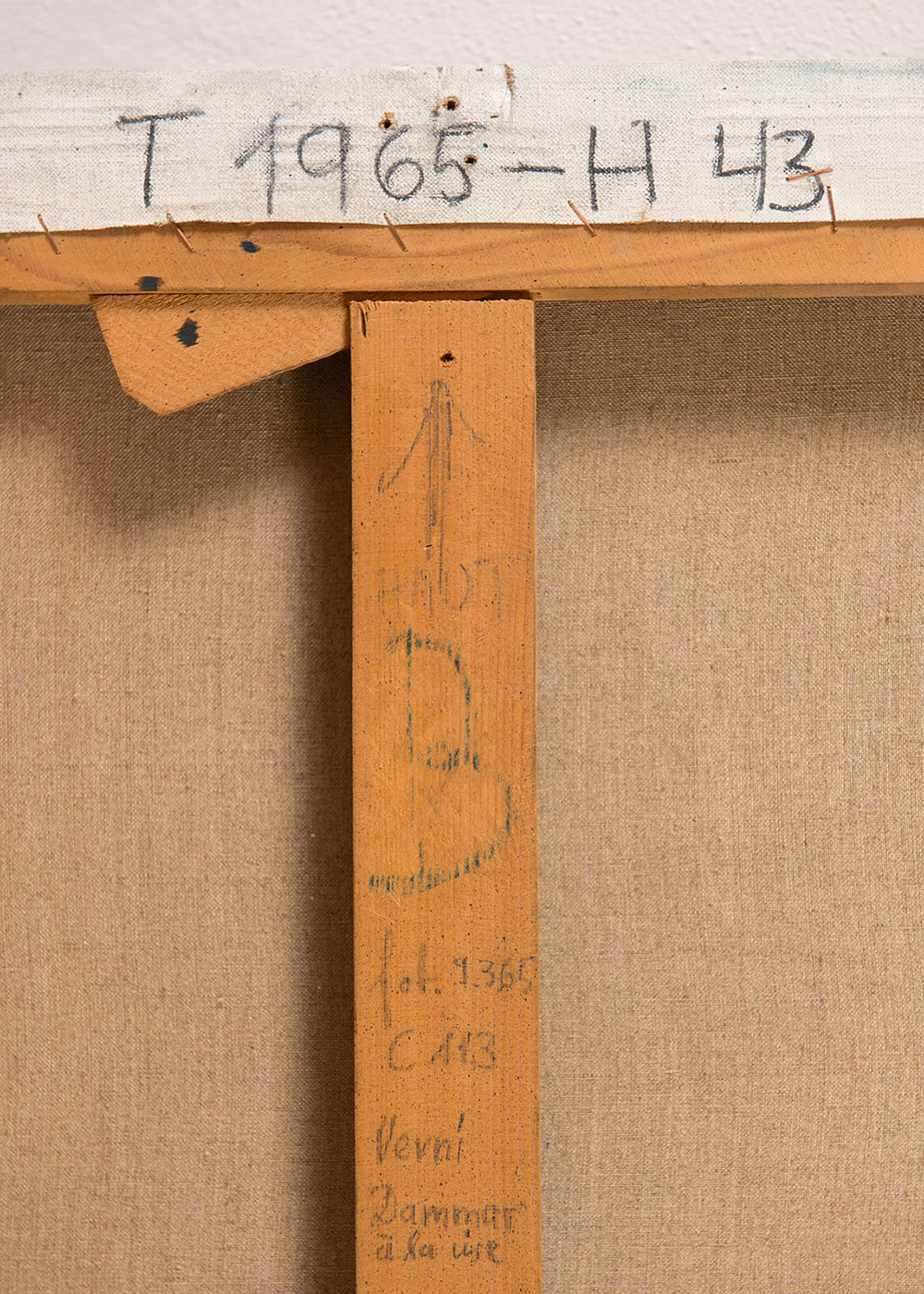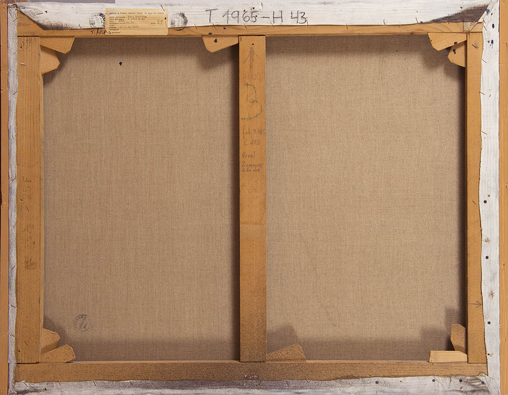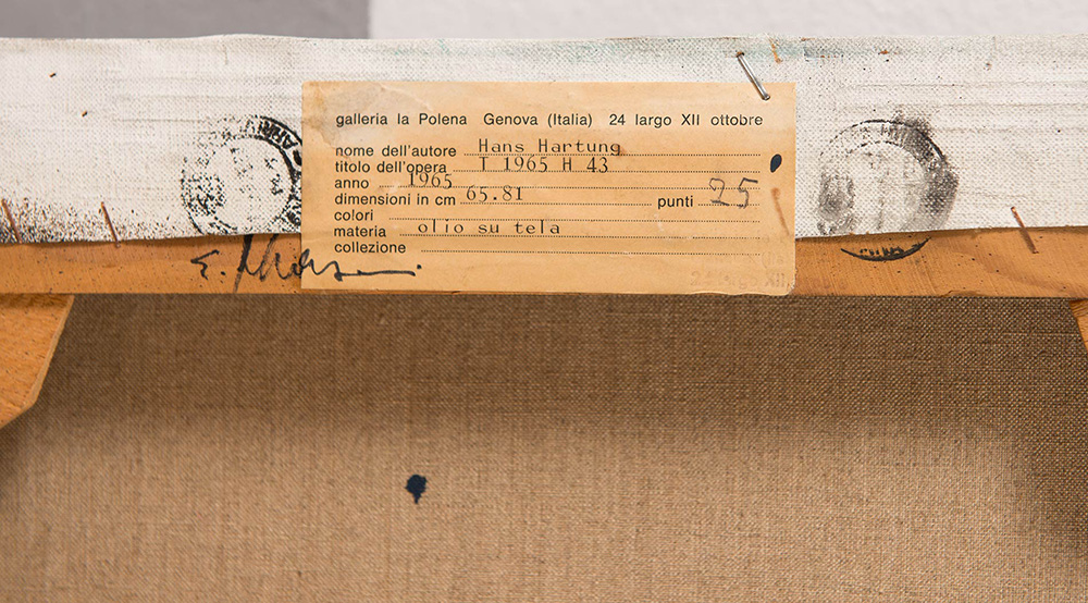 Hans Hartung (Lipsia 1904 – Antibes 1989), “T 1965-H43”, 1965. Olio su tela, firmato e datato in basso a sinistra Hartung 65, opera titolata al retro ‘T 1965-H43’, H cm 65x81 Al retro reca etichetta e timbro Galleria La Polena – Genova. Esposizioni: Hartung, Galleria la Polena, GENOVA, 1967; Hans Hartung, Galleria La Nuova Loggia, BOLOGNA, 1972; Arte Fiera Bologna, BOLOGNA, 1974. Bibliografia : Apollonio Umbro, Hartung, Galleria La Polena, Genova, 1967. Opera pubblicata in copertina di ‘HARTUNG’ - Catalogo dell’Esposizione della Galleria d’Arte La Nuova Loggia – Bologna – Gennaio 1972. Opera pubblicata in ‘2000 Incontri’ - Mensile di Bologna e dell’Emilia Romagna – Novembre 1990 – n. 11, pag. 45. L’opera sarà pubblicata nel prossimo Catalogo Ragionato di Hans Hartung a cura della Fondazione Hartung Bergman.