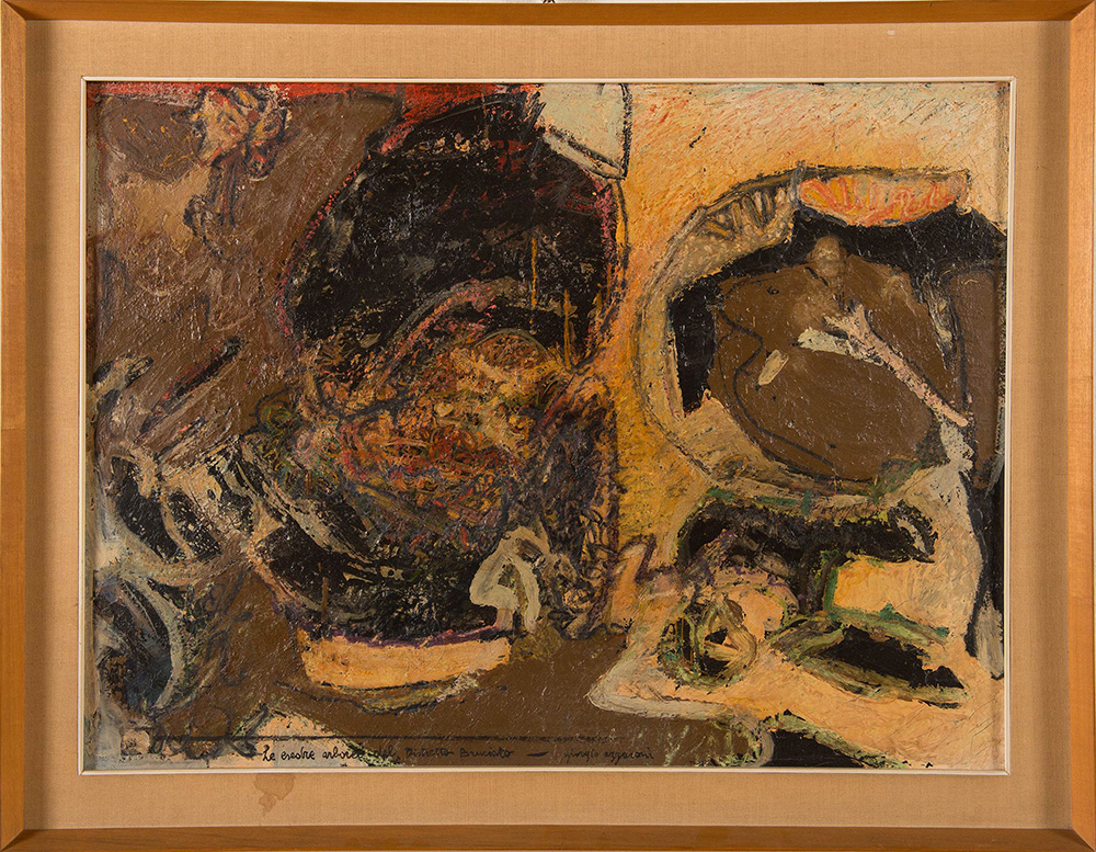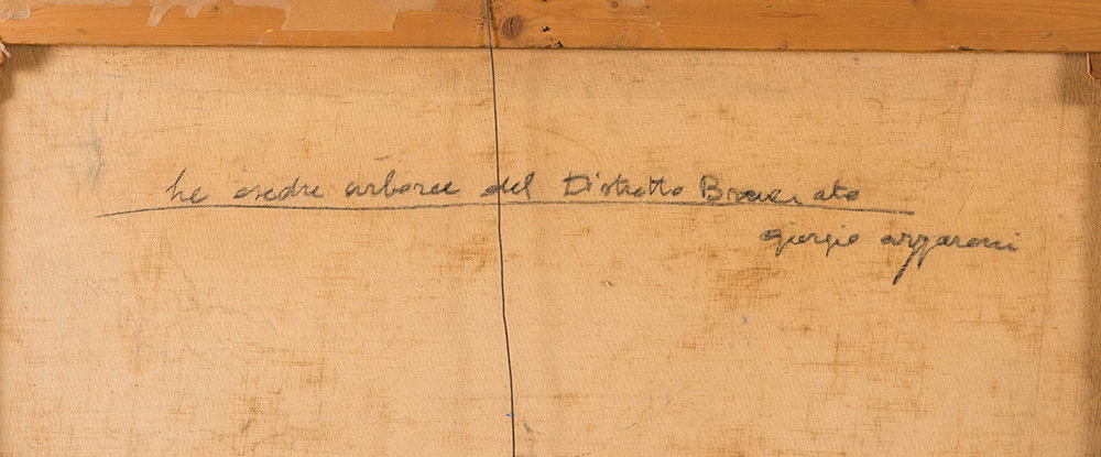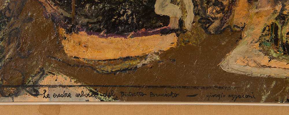 Giorgio Azzaroni (Bologna 1939), “Le esedre arboree del distretto bruciato”, Anni ‘50. Olio su tela, titolato e firmato in basso al centro ‘Le esedre arboree del distretto bruciato, Giorgio Azzaroni’, al retro titolo e firma ‘Le esedre arboree del distretto bruciato, Giorgio Azzaroni’, H cm 60x80