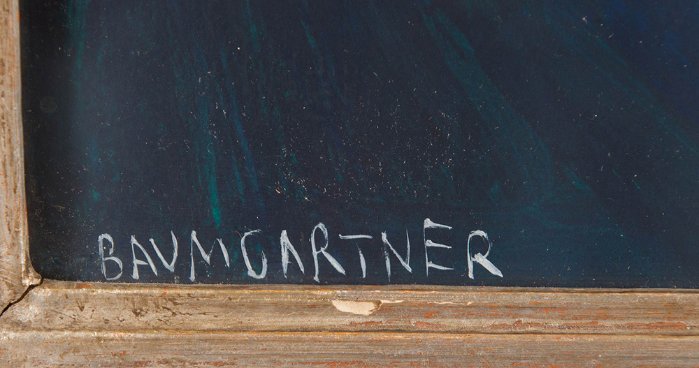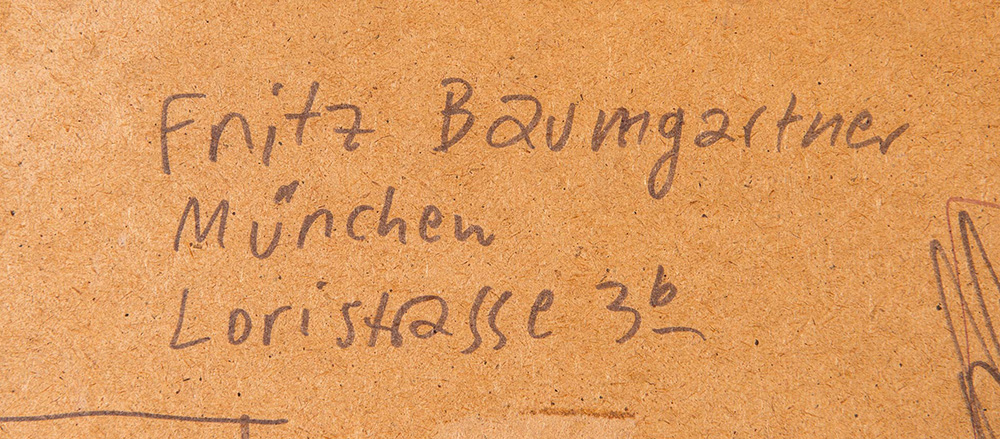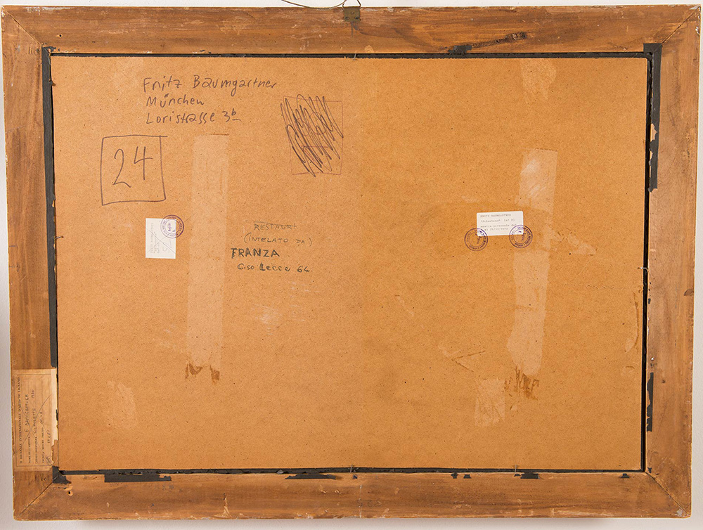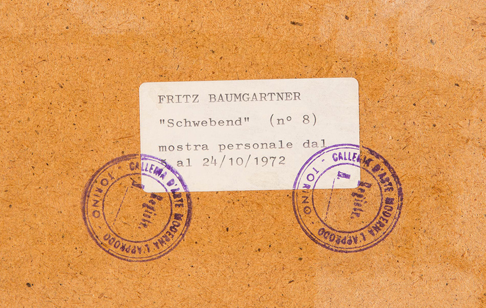 Fritz Baumgartner (Aurolzmünster 1929 - Monaco 2006), “Schwebend”, 1971. Olio su carta applicata su tela, firmato in basso a destra Baumgartner, H cm 61x85.5 Sul telaio reca etichetta Seconda Biennale internazionale d’arte di Lignano. Al retro reca etichetta e timbri Galleria d’Arte Moderna L’Approdo – Torino; etichetta Mostra Personale Galleria d’Arte l’Approdo – Torino e varie iscrizioni. Esposizioni: Galleria L’Approdo – Torino, 5-24 Ottobre 1972. N.8 del Catalogo. Opera accompagnata da certificato di autenticità della Galleria d’Arte l’Approdo in data 14 Novembre 1972, a firma Arturo Bottello.