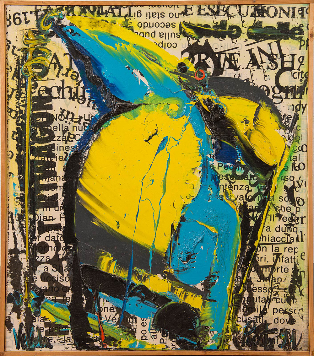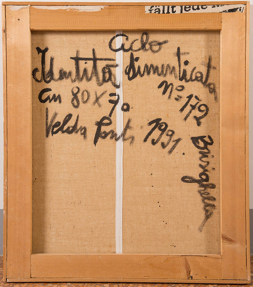 Velda Ponti (Faenza 1934), “Ciclo Identità dimenticata n. 172”, 1991. Tecnica mista e collage su tela, firmato in basso a destra Velda Ponti 91, al retro titolo, firma e data ‘Ciclo Identità dimenticata n. 172 – Velda Ponti – 1991 Baggiovara’ H cm 80x70