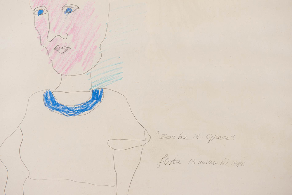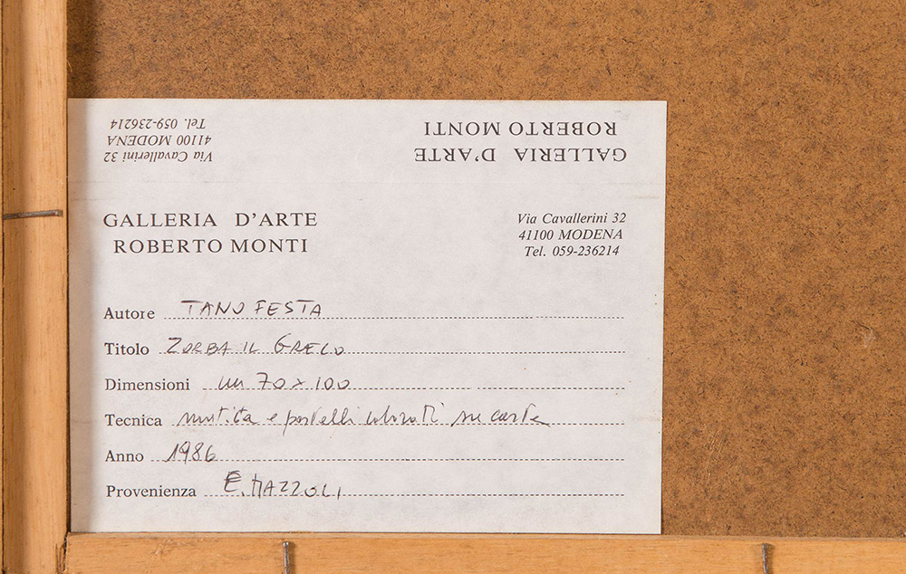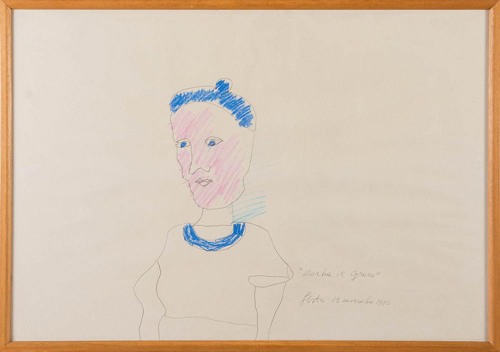 Tano Festa (Roma 1938 – 1988), “Zorba il Greco”. Tecnica mista su carta, titolato, firmato e datato in basso a destra ‘Zorba il Greco – Festa 13 novembre 1986’, H cm 70x100 Al retro reca etichetta Galleria d’Arte Roberto Monti – Modena. Provenienza: Galleria Mazzoli.