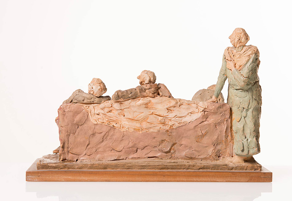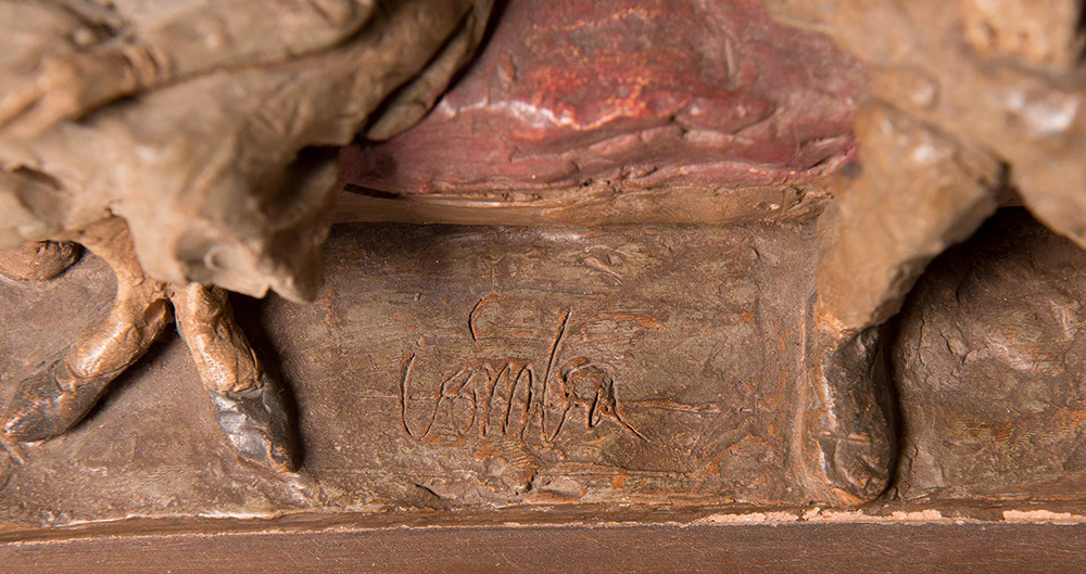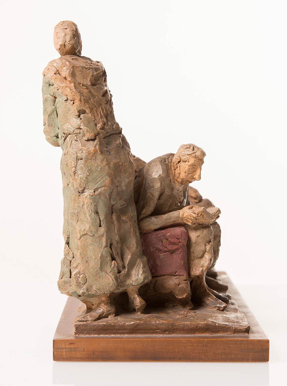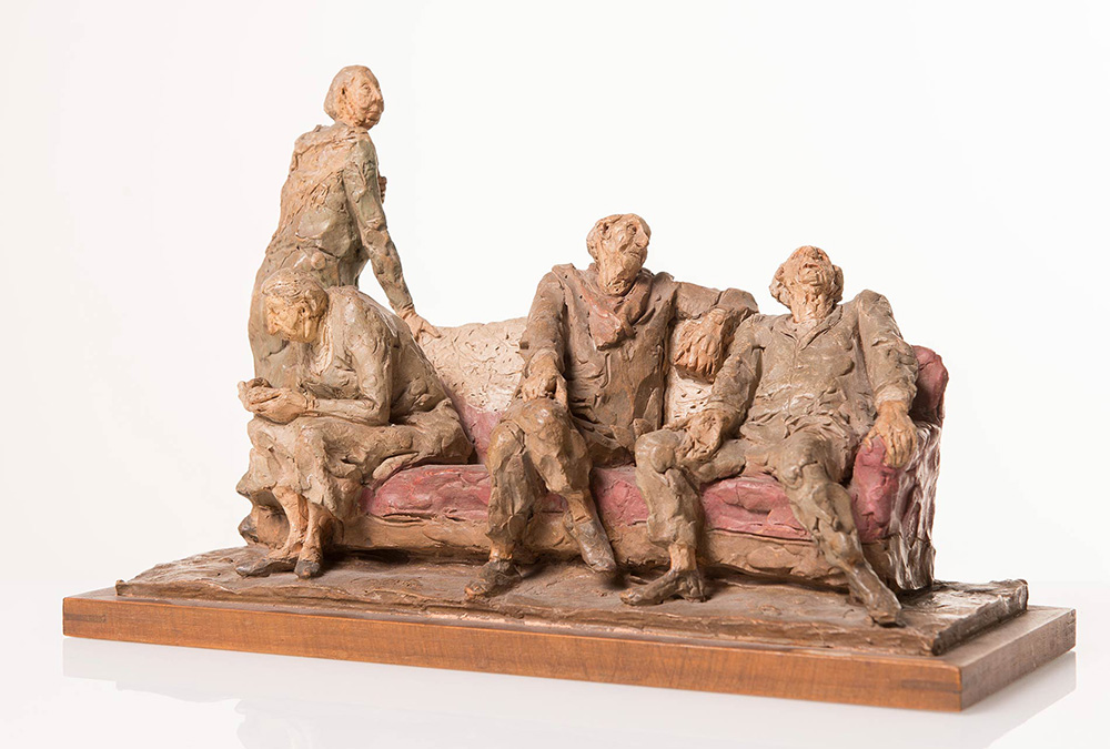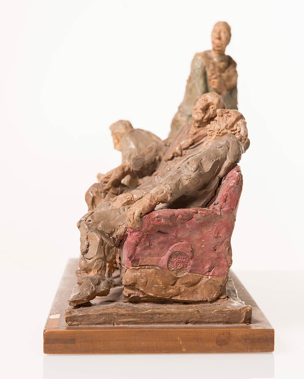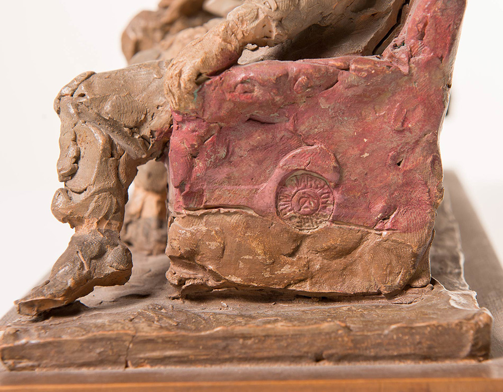 Cleto Tomba (Castel San Pietro Terme 1898 - Bologna 1987), “Gli artisti”. Scultura in terracotta policroma, firmata alla base Tomba, reca timbro CT, H cm 21.5x34x13.5