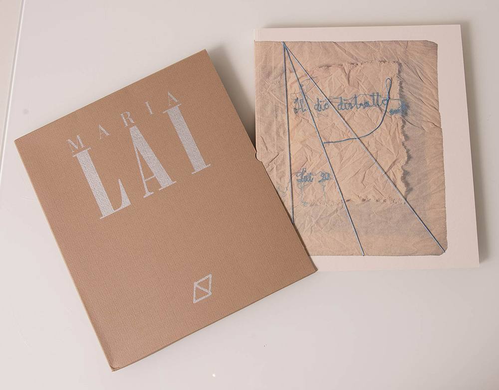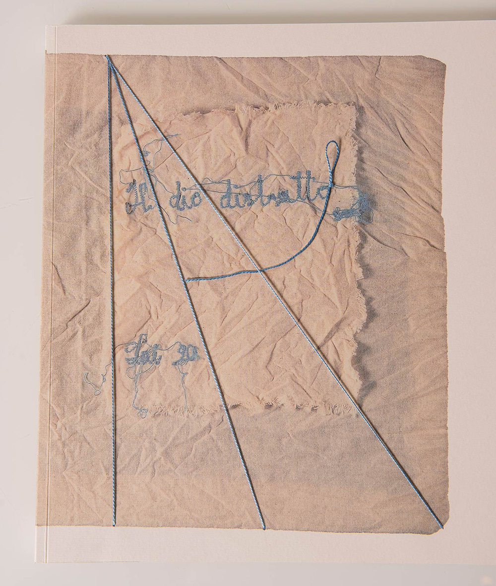 Maria Lai (Ulassai 1919 – Cardedu 2013), “Il Dio distratto”, 2002. Applicazione di fili di cotone sulla copertina del libro ‘Il Dio distratto – Maria Lai’, interpretazione per immagini di un racconto di Giuseppe Dessì, testo di Maria Lai, Ed. Arte Duchamp Cagliari, H cm 32x28x2