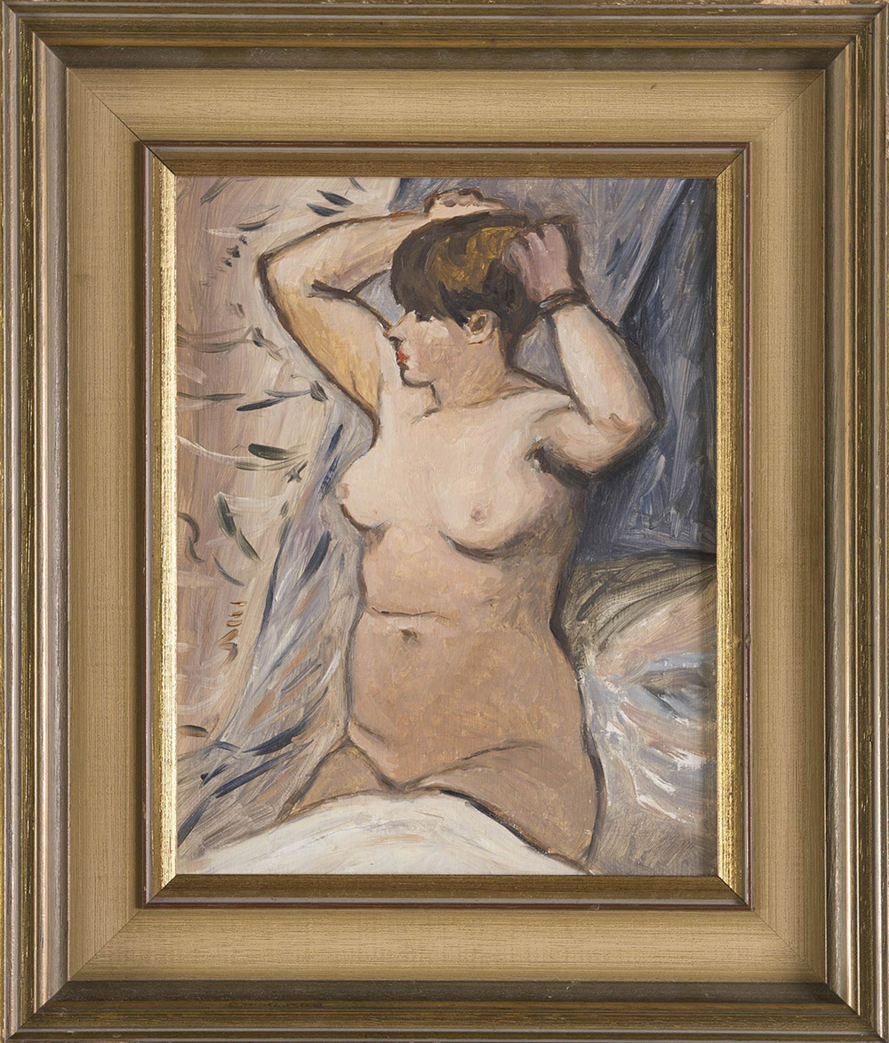 Artista del XX sec., “Nudo femminile”. Olio su faesite, H cm 35x27 Al retro reca etichetta non decifrata.