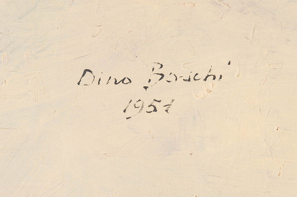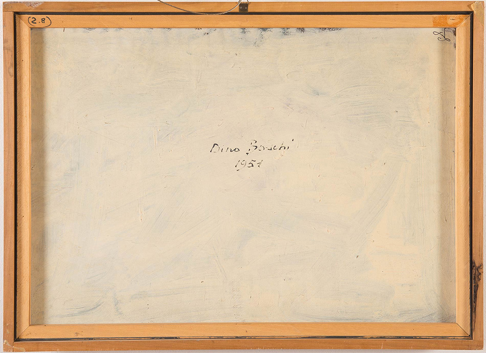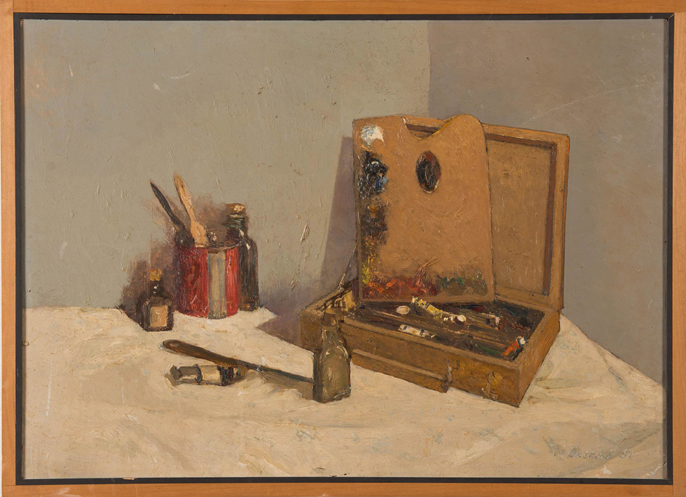 Dino Boschi (Bologna 1923 – 2015), “Strumenti del pittore”, 1951. Olio su tavola, firmato e datato in basso a destra Boschi 51, al retro firmato e datato al retro Dino Boschi 1951, H cm 46x66