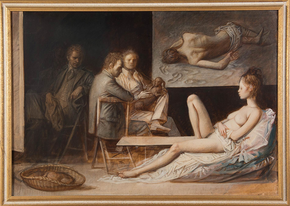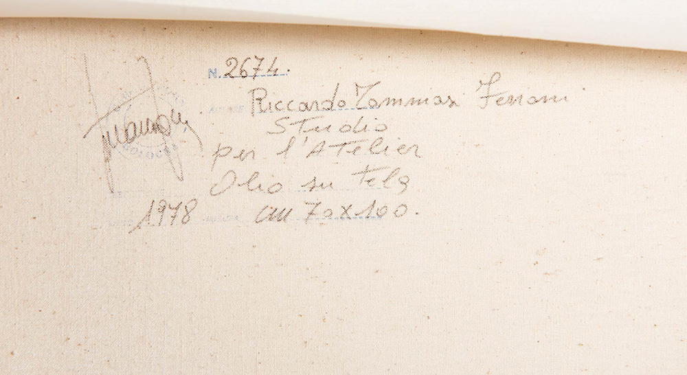 Riccardo Tommasi Ferroni (Pietrasanta 1934 - Pieve di Camaiore 2000), “Studio per l’Atelier”, 1978. Olio su tela, al retro opera firmata e datata ‘Riccardo Tommasi Ferroni 1978’, H cm 70x100 Al retro reca timbro a secco della Galleria d’Arte Forni – Bologna. Opera accompagnata da certificato di autenticità su fotografia firmato dall’artista e con timbri della Galleria Forni -Bologna.
