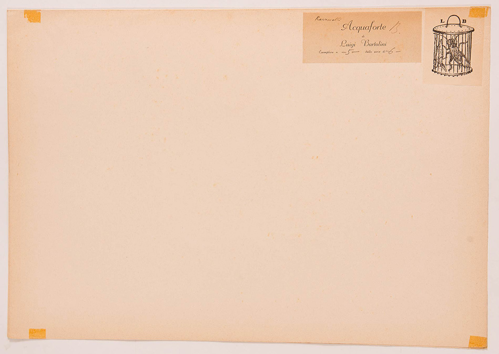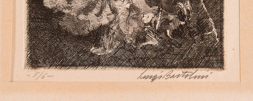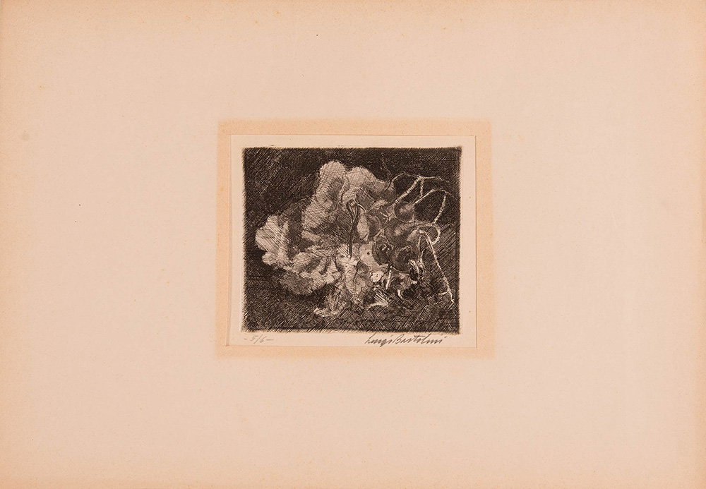 Luigi Bartolini (Cupramontana 1892 - Roma 1963), “Ravanelli”. Incisione all’acquaforte su carta, firmata in basso a destra Luigi Bartolini, numero di tiratura in basso a sinistra 5/6, reca timbro a secco ‘Luigi Bartolini incisione all’acquaforte’, Lastra H cm 13.6x16 Al retro reca etichetta di Luigi Bartolini e timbro a secco LB.