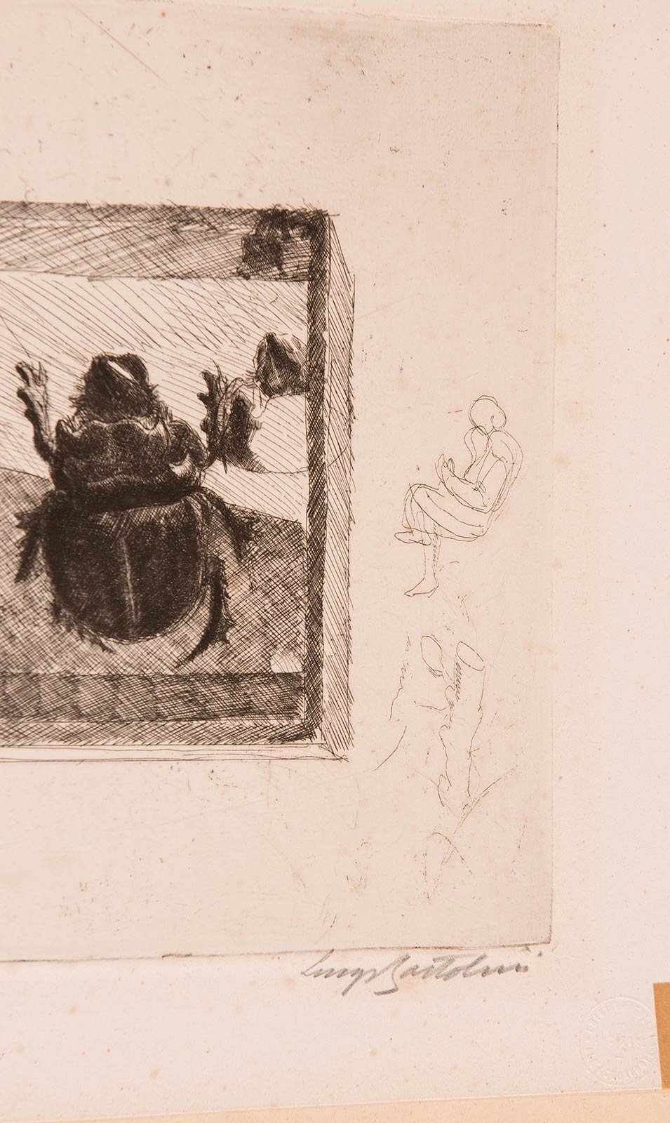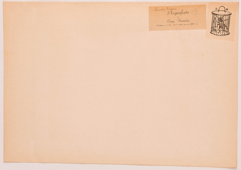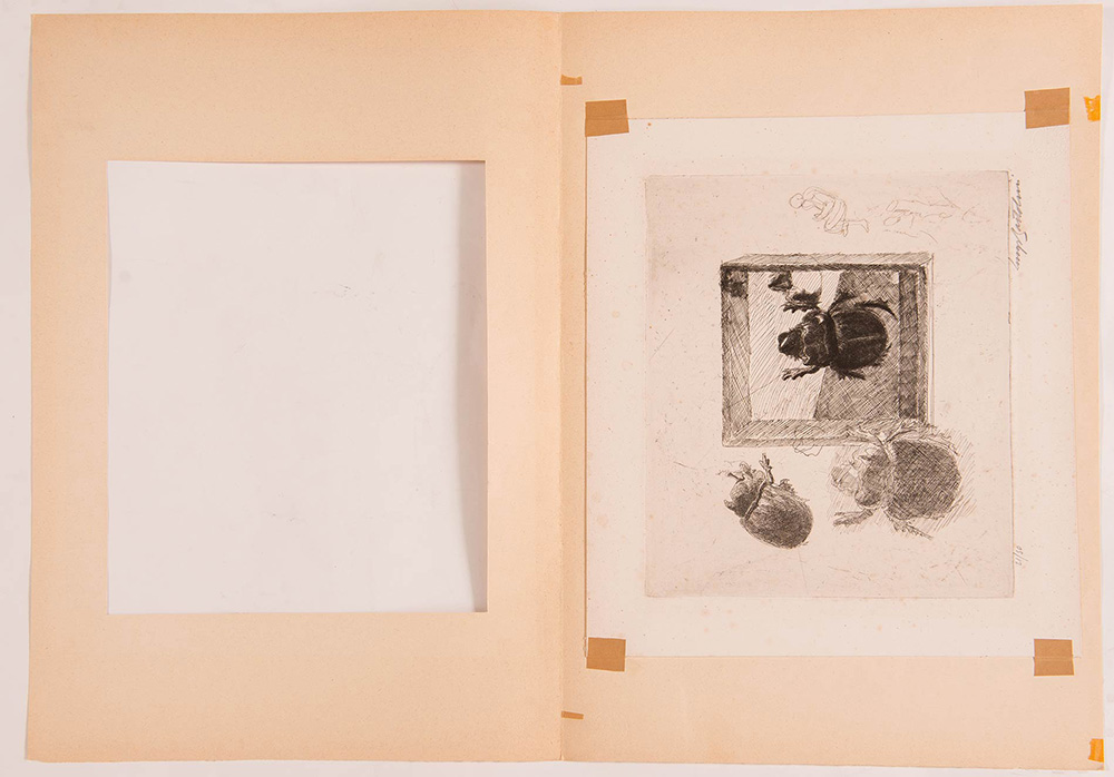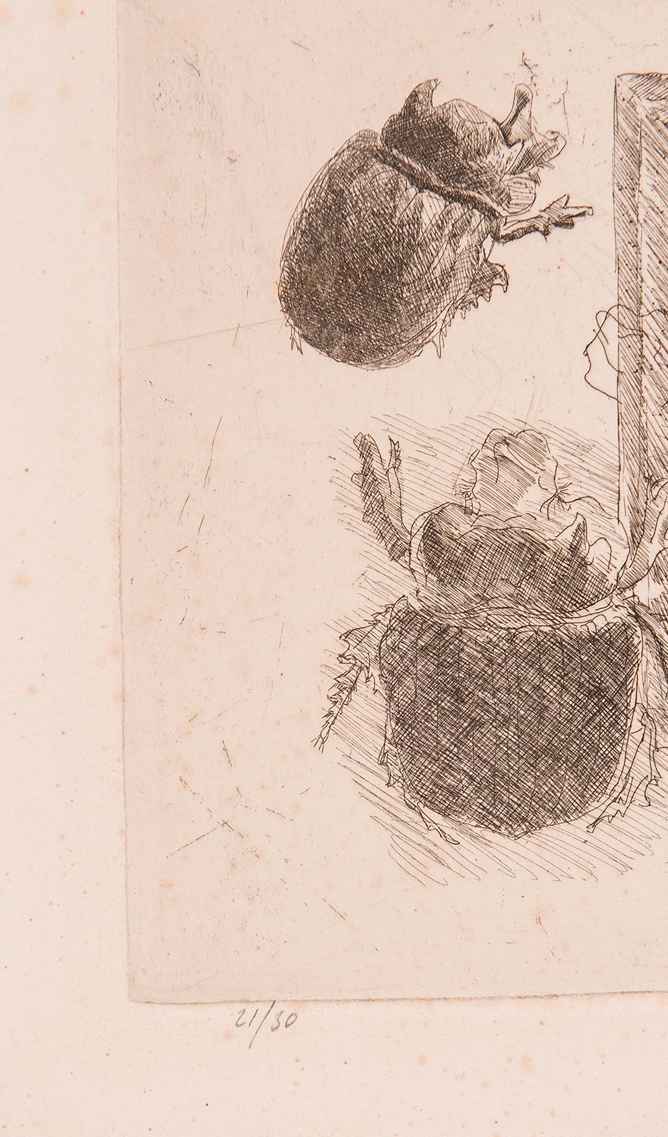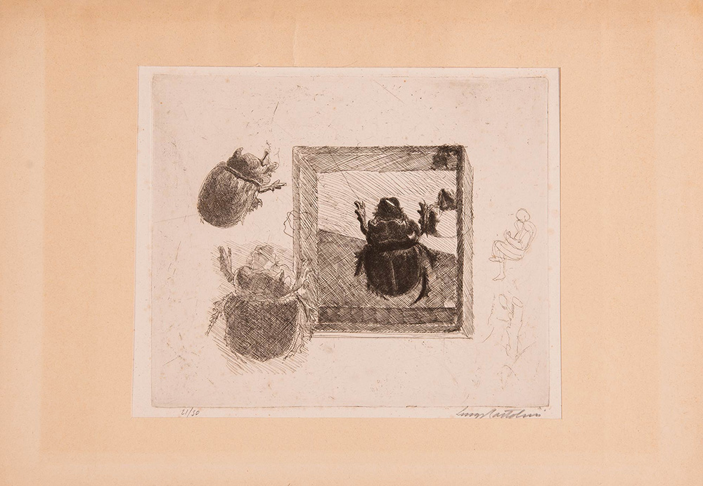 Luigi Bartolini (Cupramontana 1892 - Roma 1963), “Scarabeo Ercole”. Incisione all’acquaforte su carta, firmata in basso a destra Luigi Bartolini, numero di tiratura in basso a sinistra 21/30, reca timbro a secco ‘Luigi Bartolini incisione all’acquaforte’, Lastra H cm 23.7x28.5 Al retro reca etichetta di Luigi Bartolini e timbro a secco LB.