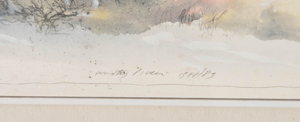 Walter Piacesi (Ascoli Piceno 1929), “Villa Scheriman-Widmann-Foscari”, 1988/89. Tecnica mista su cartone, firmato in basso al centro Walter Piacesi 1988/89, al retro opera firmata datata e titolata ‘Walter Piacesi 1988/89- Villa Scheriman-Widmann-Foscari’, H cm 27x73