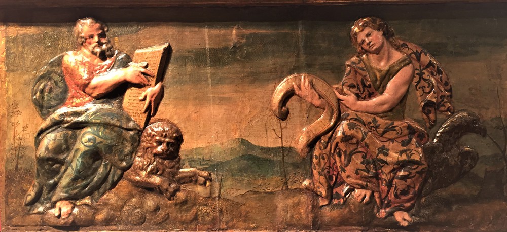 SCULTORE SPAGNOLO DEL XVI SEC. cm 110x56 Importante coppia di pannelli a rilievo in legno di pioppo policromo e dorato "i quattro Evangelisti, San Marco, San Giovanni, San Luca e San Matteo" La superfice è interamente dorata, al disopra della lamina è stesa la pittura poi graffiatra. per far riapperire l'oro sottostante. Tecnica mutuata dalla Spagna ove dal quattrocento in poi furono chiamati a lavorare artisti italiani.