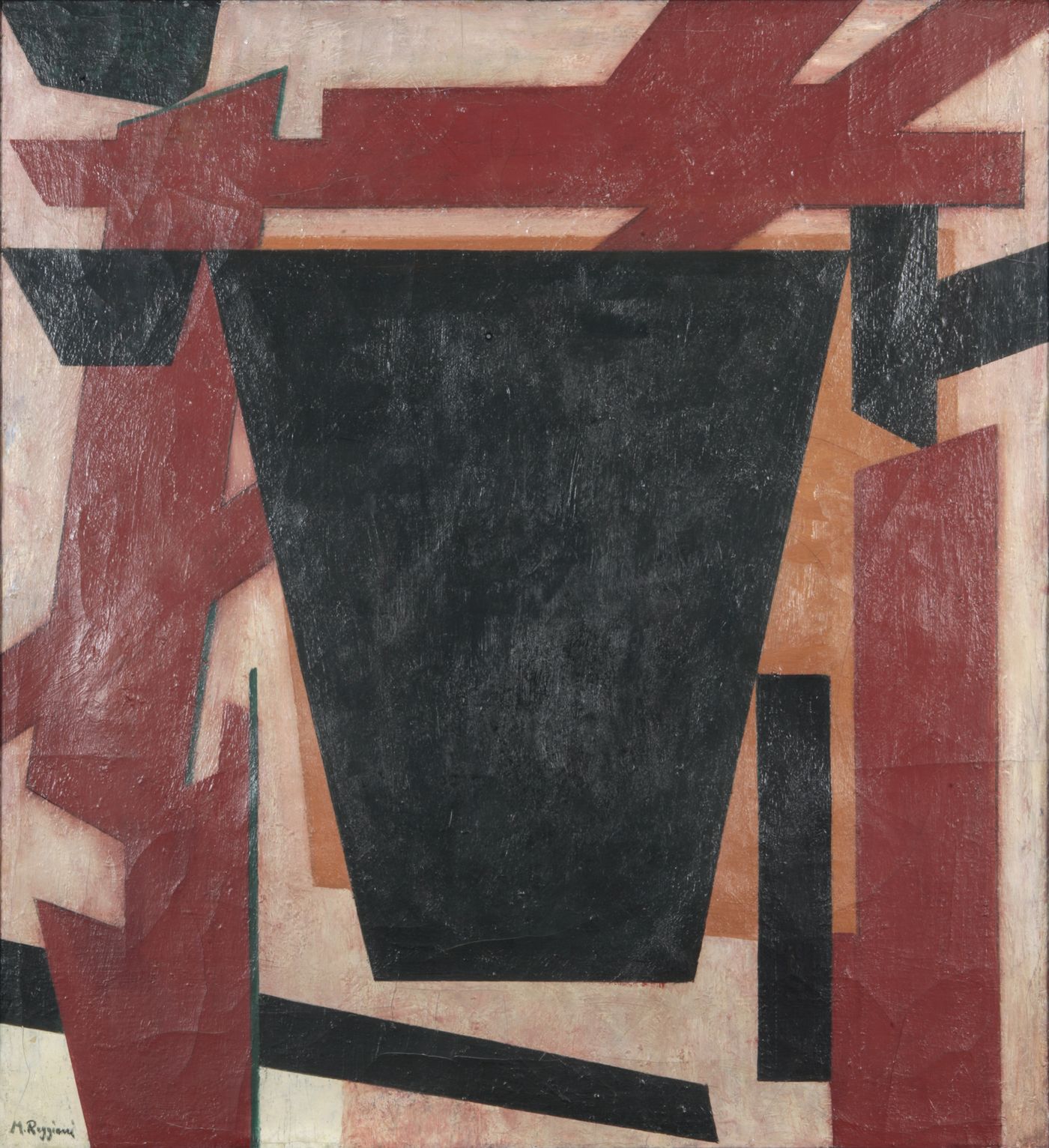 REGGIANI MAURO Nonantola (MO) 1897 - 1980 Milano "Composizione" 1958 81x75 olio su tela Opera firmata in basso a sinistra, e datata l retro Già atelier del pittore, Milano (etichetta al retro) Già Galleria Vinciana, Milano (timbro al retro) Già Galleria del Girasole, Udine (etichetta al retro) Già Galleria Cardelli e Fontana, Sarzana (etichetta al retro)