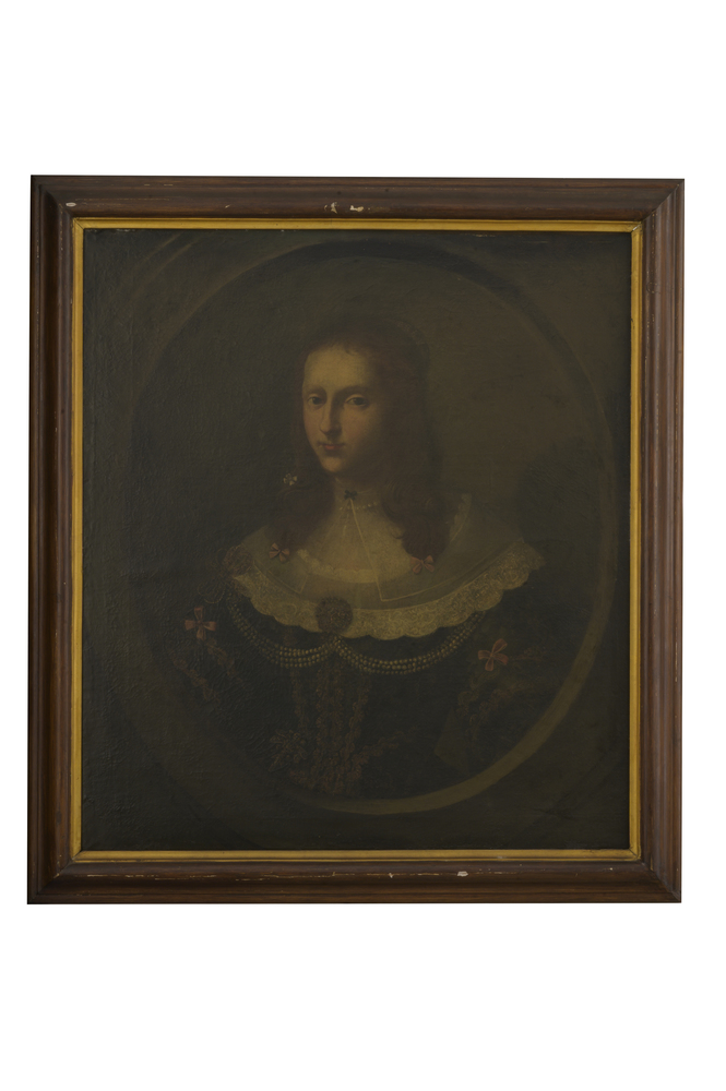MAESTRO OLANDESE ATTIVO NEL XVII SEC. "Ritratto di ragazza" Olio su tela cm 80x71 La splendida opera ritrae una giovane donna adornata di fiocchi nei capelli, vestita di un abito nero ricamato d'oro, il collo e le spalle sono ammantate di velo e di pizzo. Il volto serio ma non austero unito ad un abito sontuoso con spille e vari giri di perle ci riconducono al rango nobiliare dell'effigiata. La figura è dipinta in ovato. Lo studio dell'acconciatura e dell'abbigliamento ci permettono di datare l'opera tra il quarto e il quinto decennio del XVII sec.