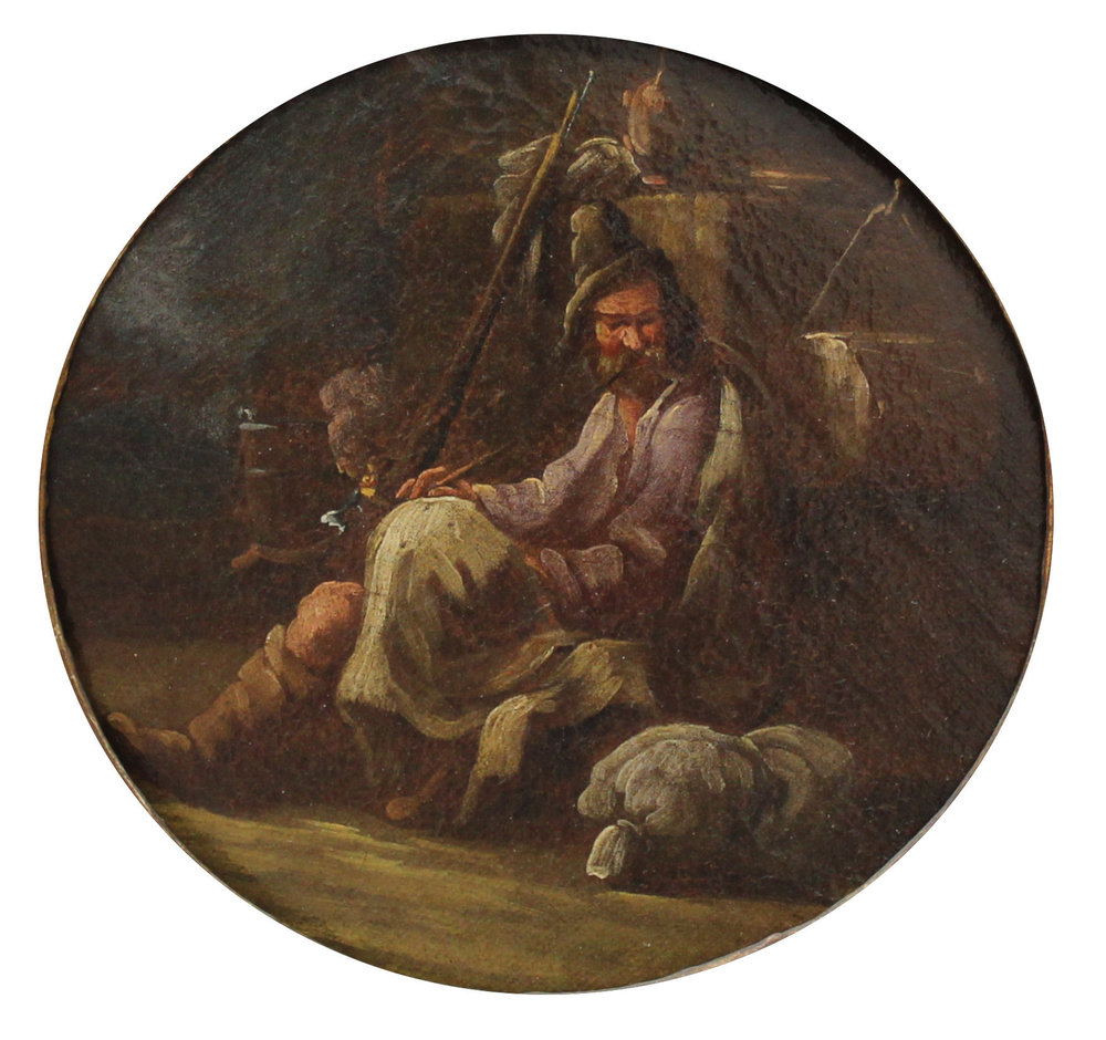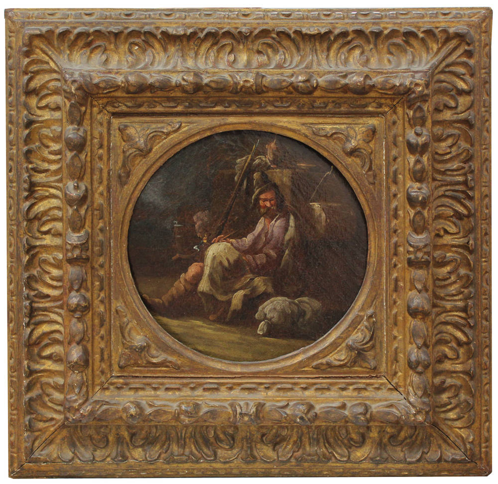 PITTORE LOMBARDO DEL XVII/XVIII SEC. "Riposo del cacciatore" Olio su tela applicata su tavola diametro cm 21