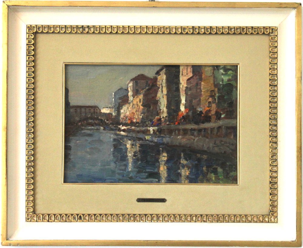 ERMA ZAGO (Bovolone 1880-Milano 1942) "I Navigli di Milano" Olio su tavola cm 24,5x36 Nato in provincia di Verona e milanese d'adozione Ermanno Giovanni Zago, in arte Erma, divide la sua carriera dipingendo vedute veneziane e milanesi. Tanto veloce e materico nella pennellata quanto brioso nelle tinte, offre in ogni sua opera un'espressione raggiante delle due città. Espone a Milano, Torino, Roma, Fiume e alla Biennale d'arte di Venezia nel 1928 e 1940.