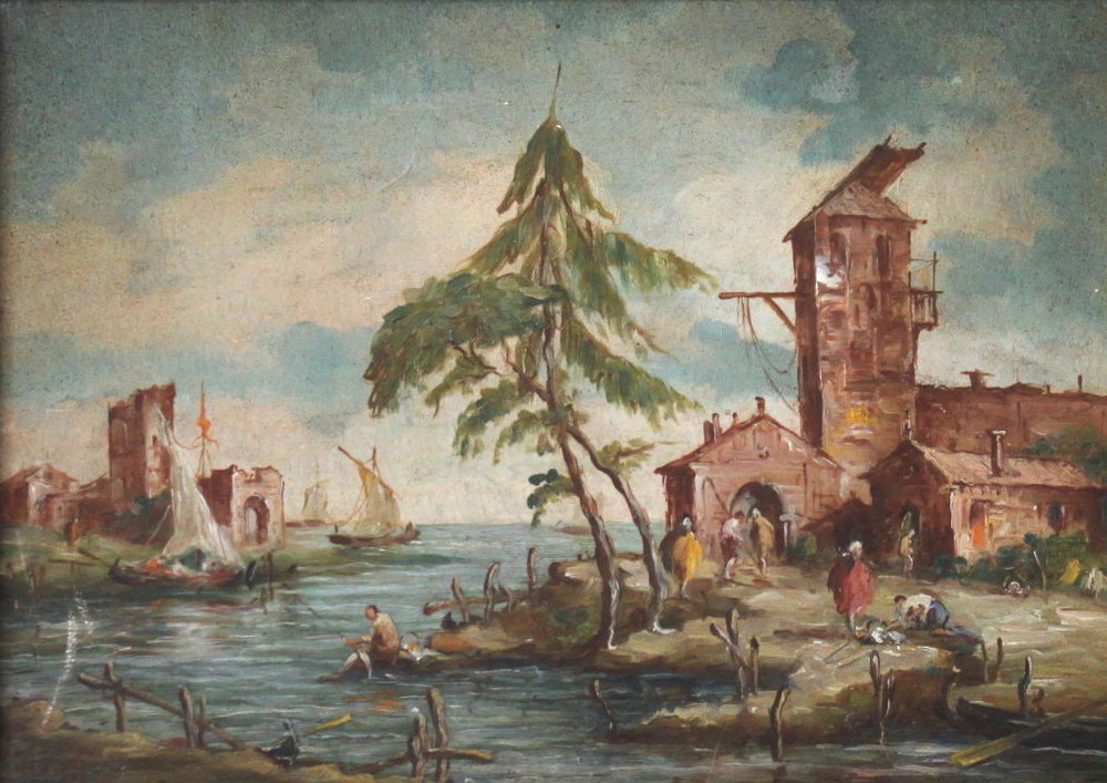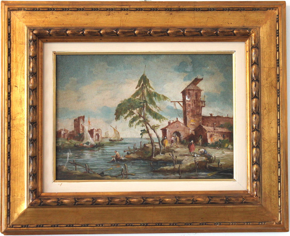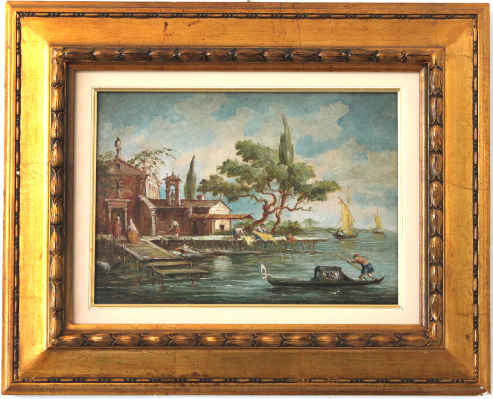 LUCIA PONGA degli ANCILLO (Venezia 1887-Vittorio Veneto 1966) "Isola della laguna" "Capriccio in laguna" Coppia di oli su tavola cm 24,5x35