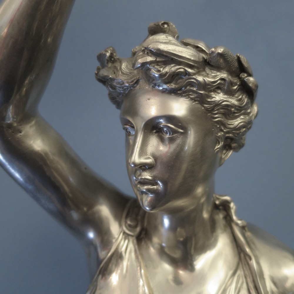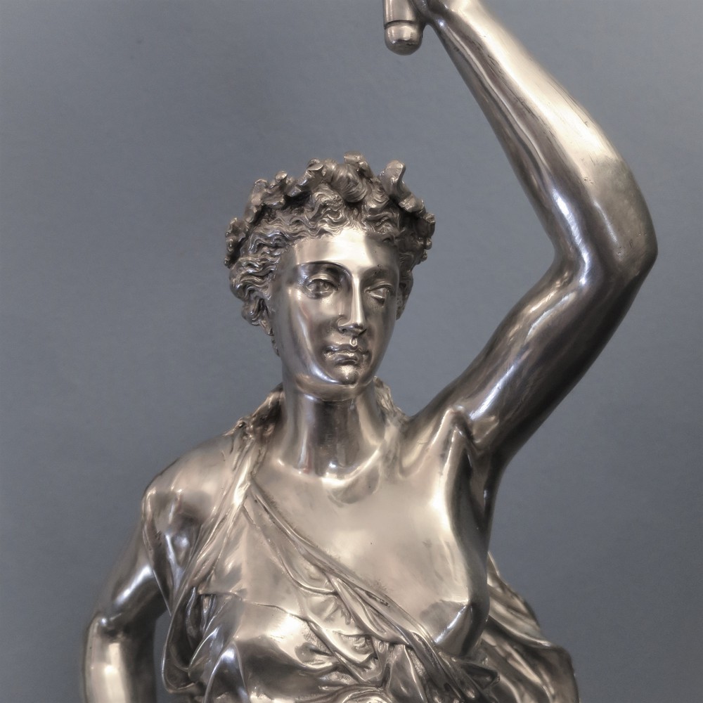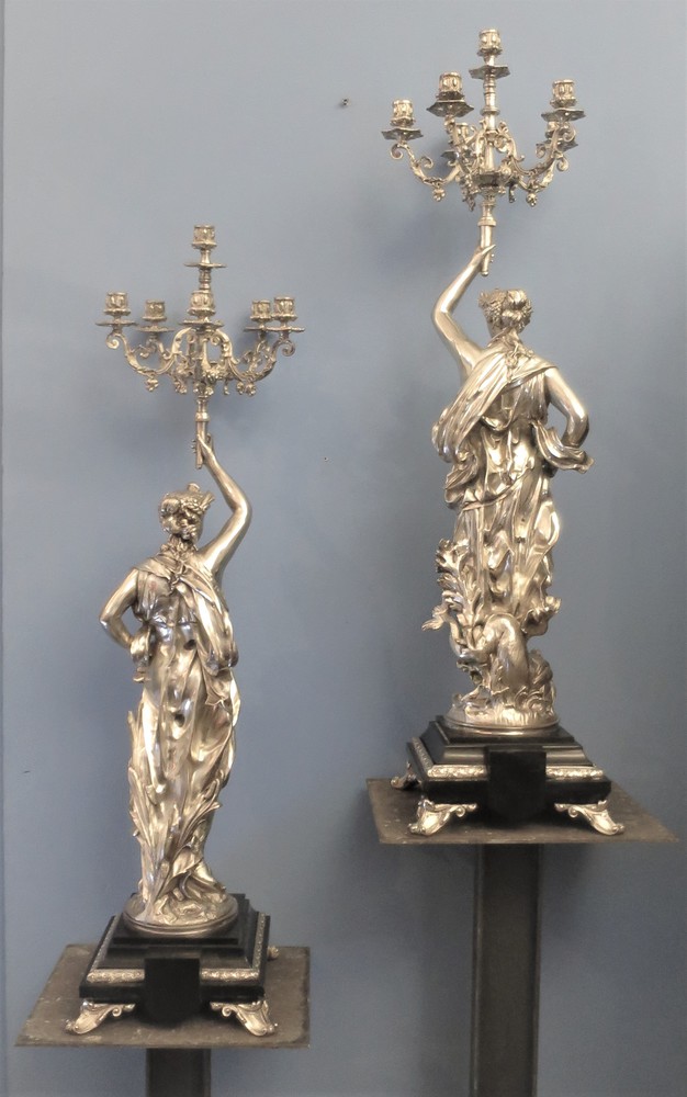 COPPIA DI CANDELABRI in bronzo argentato poggiante su base di marmo nero con decori applicati. Di gusto neoclassico. Francia XIX sec. Firmati cm 101
