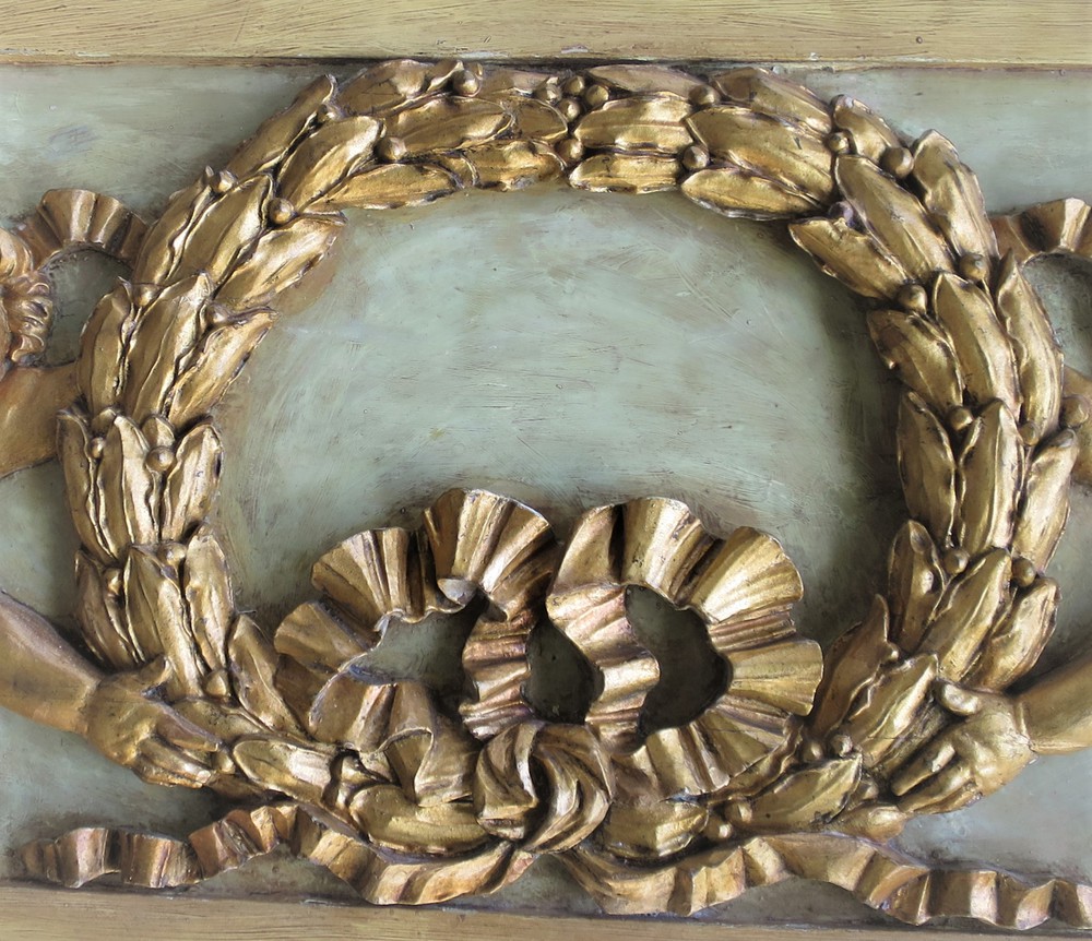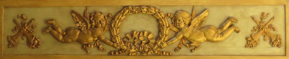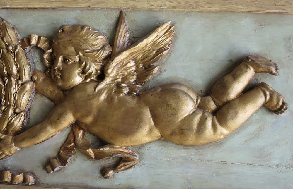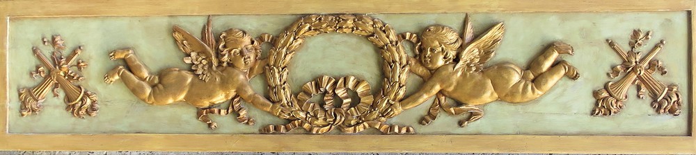 PANNELLO DECORATIVO DEL XIX SEC. "Putti con corona di alloro" legno scolpito ad alto rilievo dorato e laccato. cm 45,5x207