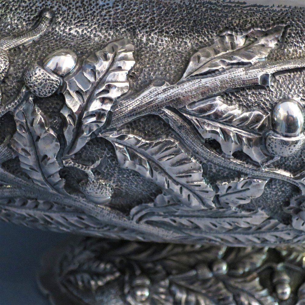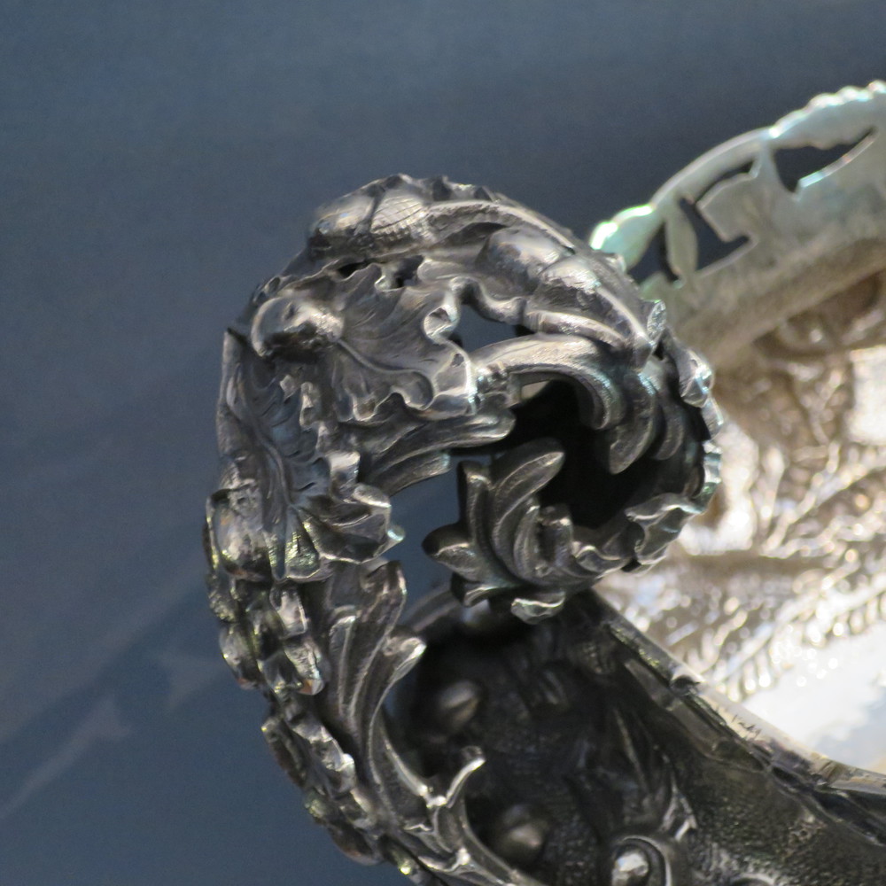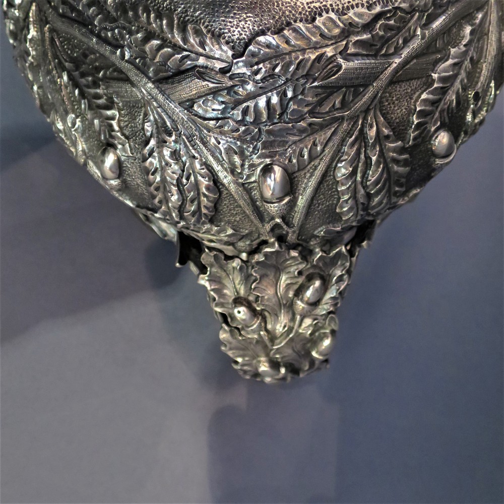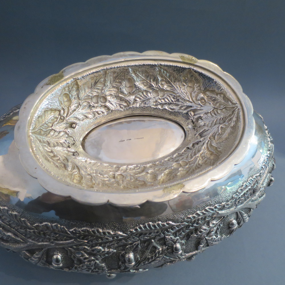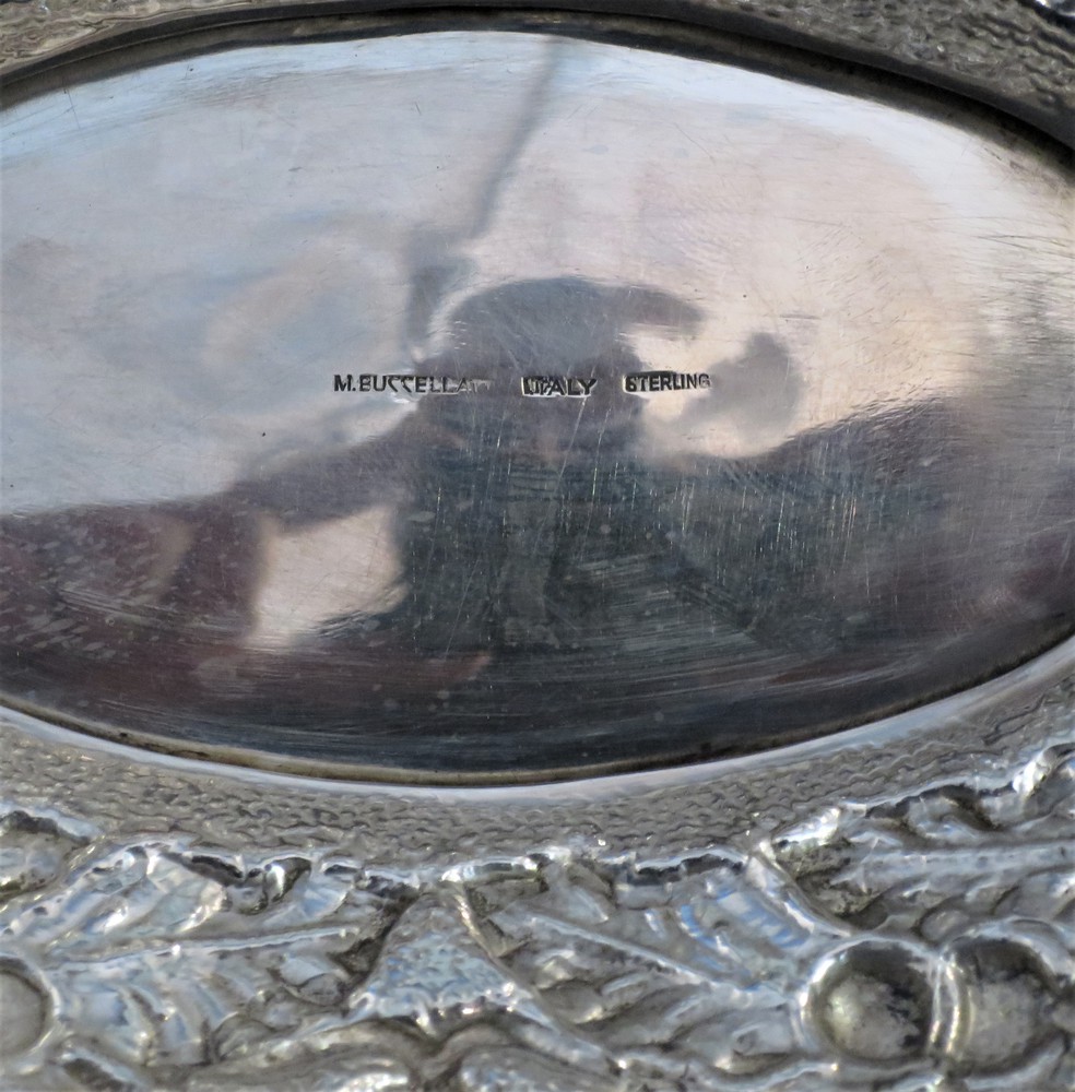 MARIO BUCCELLATI Grande centro tavola in argento a forma ovale. Corpo lavorato a forte sbalzo a decori fogliacei e ghiande marchi in uso prima del 1935 dimensioni:cm 46x29 altezza: cm 24,5 peso: gr 2869