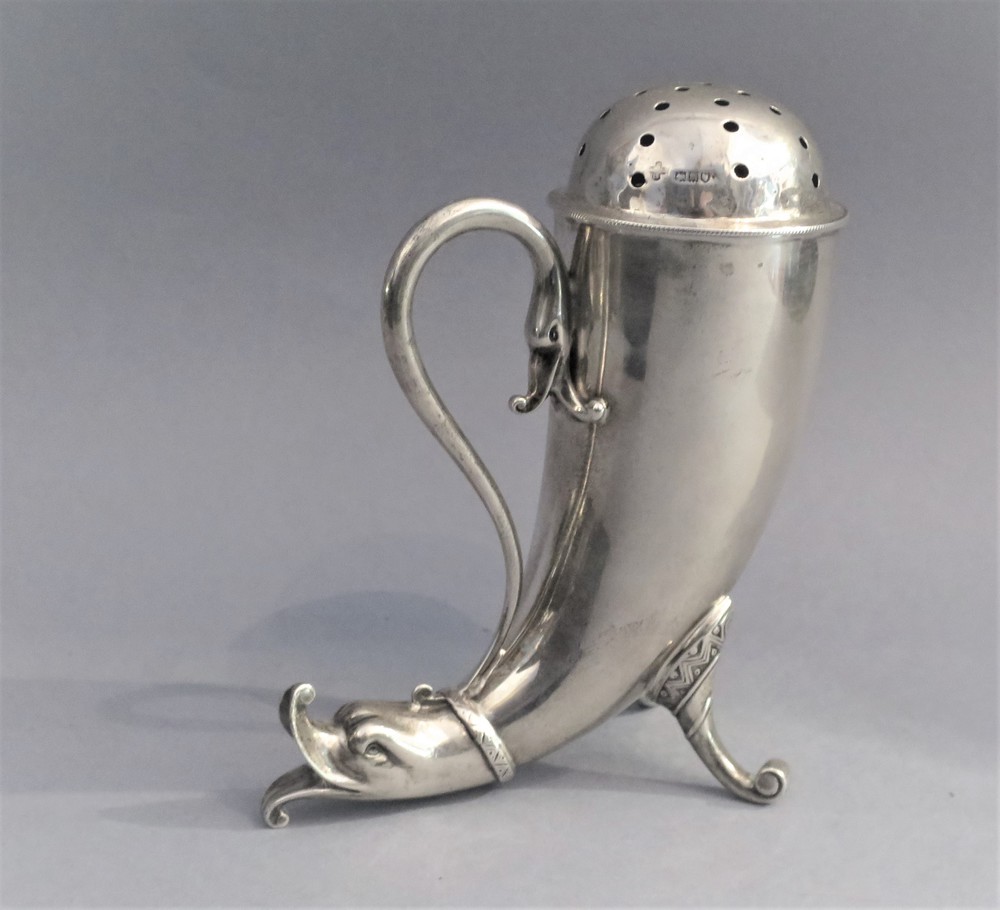 SPARGIZUCCHERO In argento, corpo liscio sagomato terminarte a motivo zoomorfo. Londra 1907 altezza cm 14 peso gr. 203 ca.