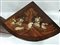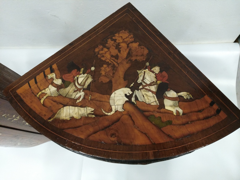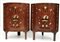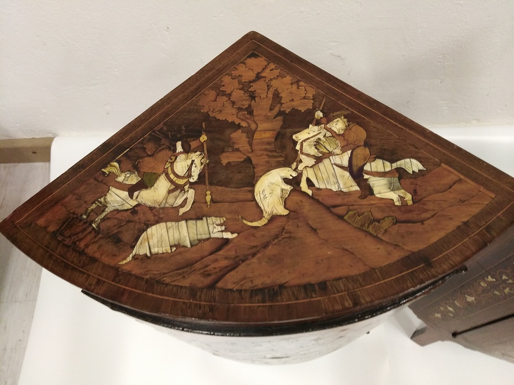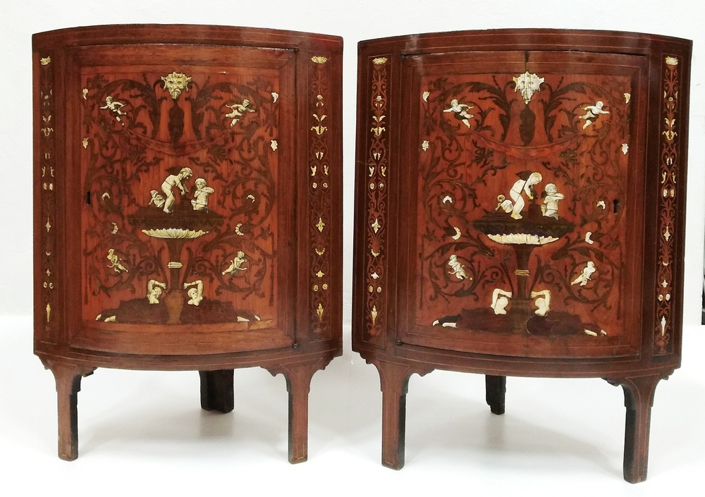 COPPIA DI ANGOLIERE XIX SEC. Rara coppia di angolari in noce bombati ad una anta, ricco intervento di tarsie in acero chiaro, essenze ed avorio. Scene di caccia ai piani, angeli e volute fogliacee al fronte. Leggere filettature a riquadro. h cm 48