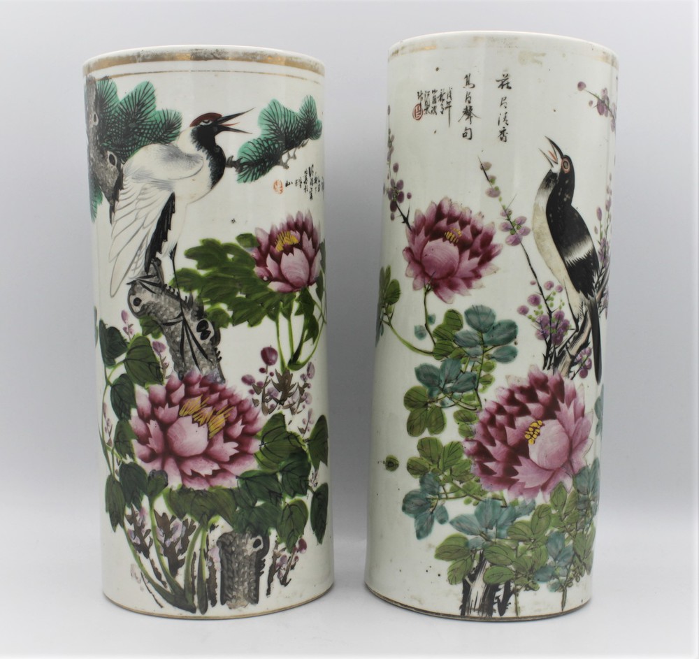 COPPIA DI VASI CILINDRICI decorati con motivi floreali. Porcellana Cina inizi XX sec. cm 28,5