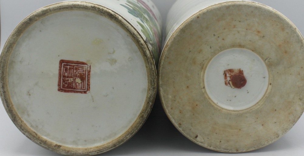 COPPIA DI VASI CILINDRICI decorati con motivi floreali. Porcellana Cina inizi...