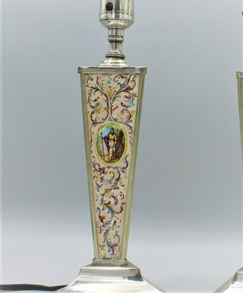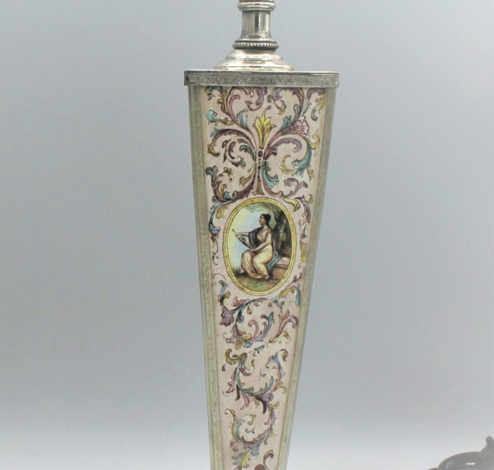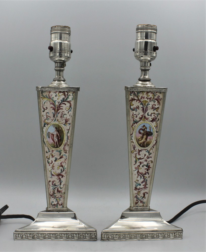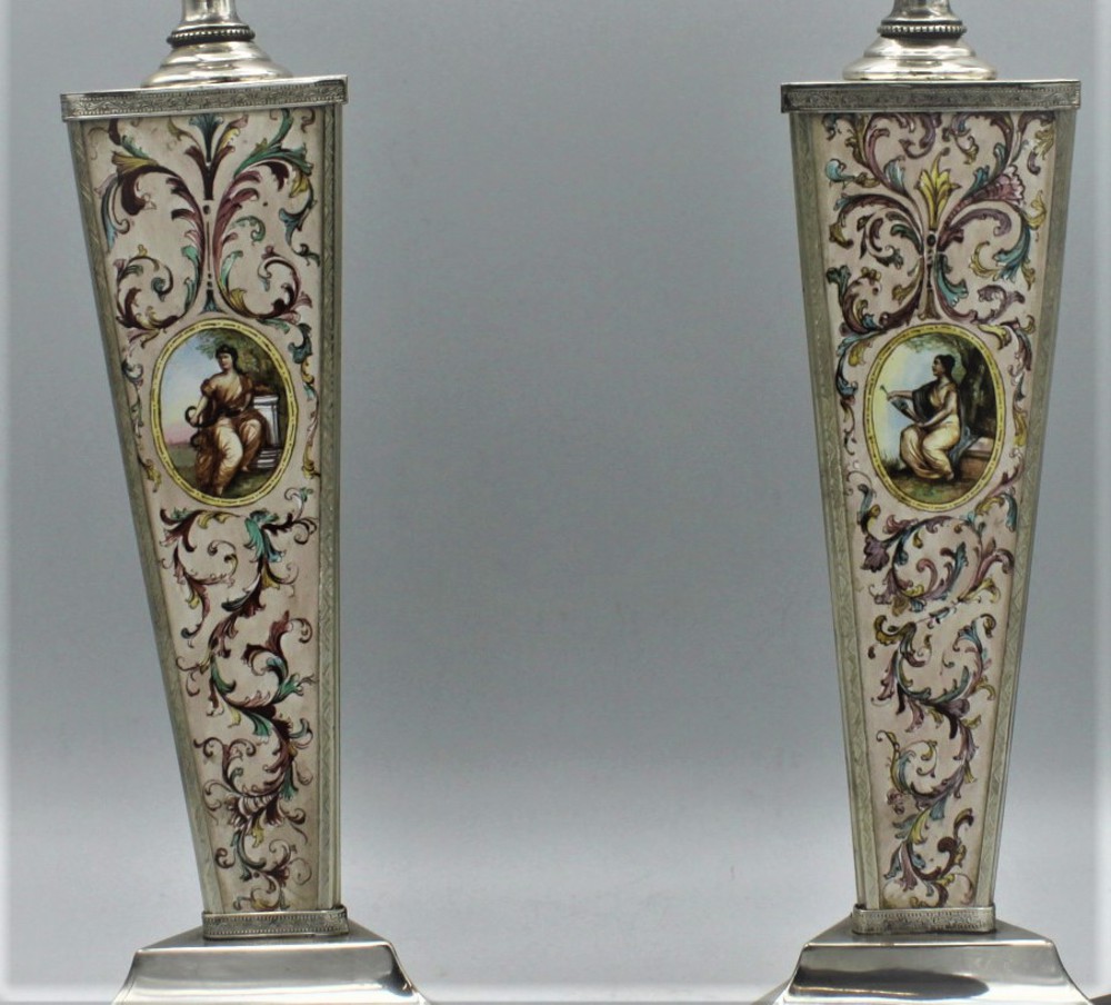 MANIFATTURA VIENESE DEL XIX SEC. Coppia di candelieri in argento con placche smantate con personaggi al centro e decori a ramage. cm 33