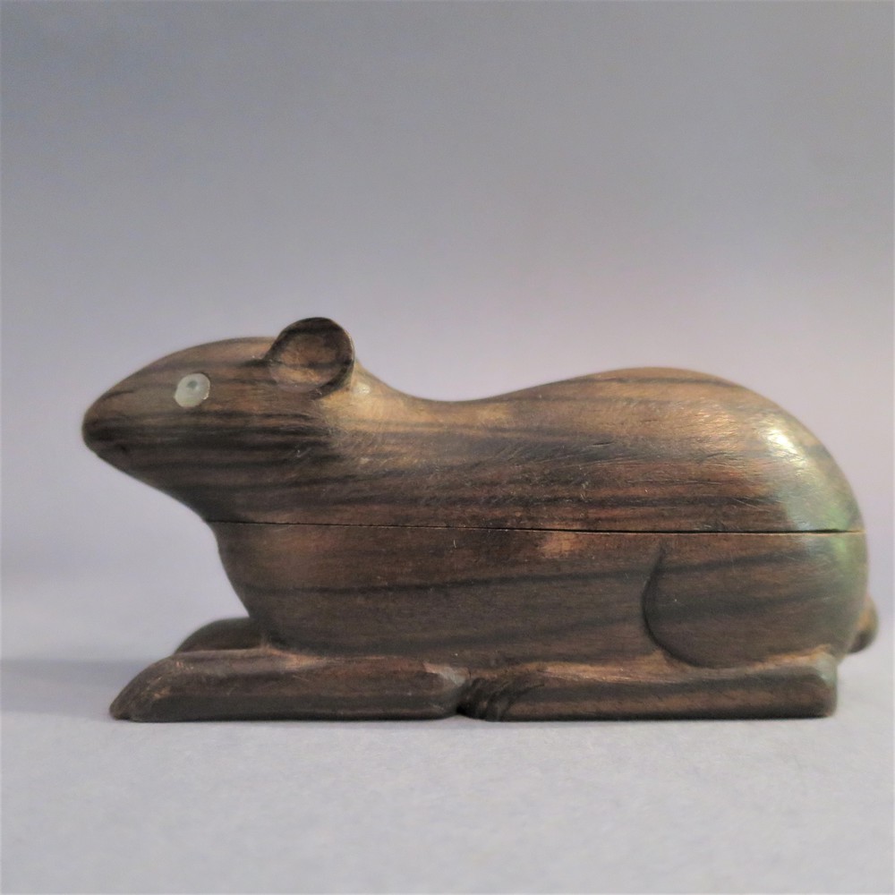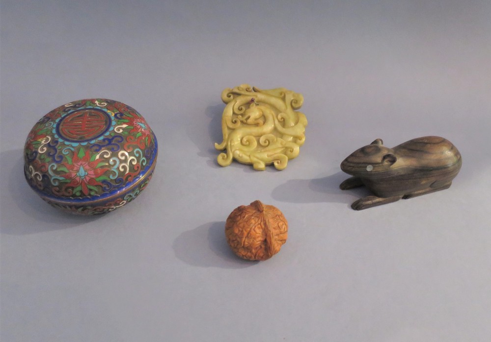 LOTTO DI OGGETTI ORIENATLI Composto da una scatola closoinette, penndente in giada verde, noce scolpita e una scatola a forma di topo in legno