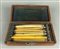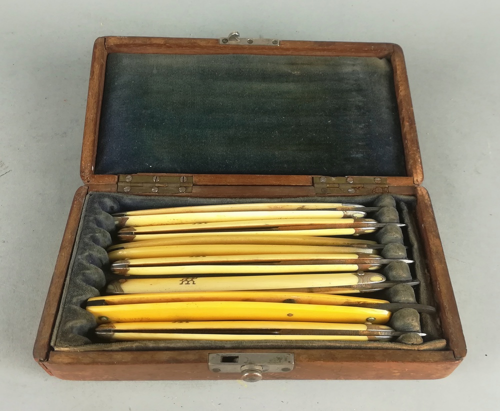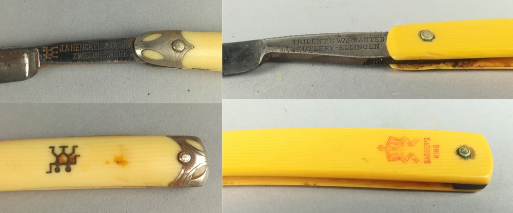 RASOIO Astuccio con sette rasoi con manici in osso. Sei marcati J.A. HENCKELS SOLINGEN ZWILLINGSWERK e uno TRIDENT'S WARRANTED CUTLERY - SOLINGEN - BARBER'S KING. Germania Inizi XX secolo. cm 18x9,S