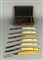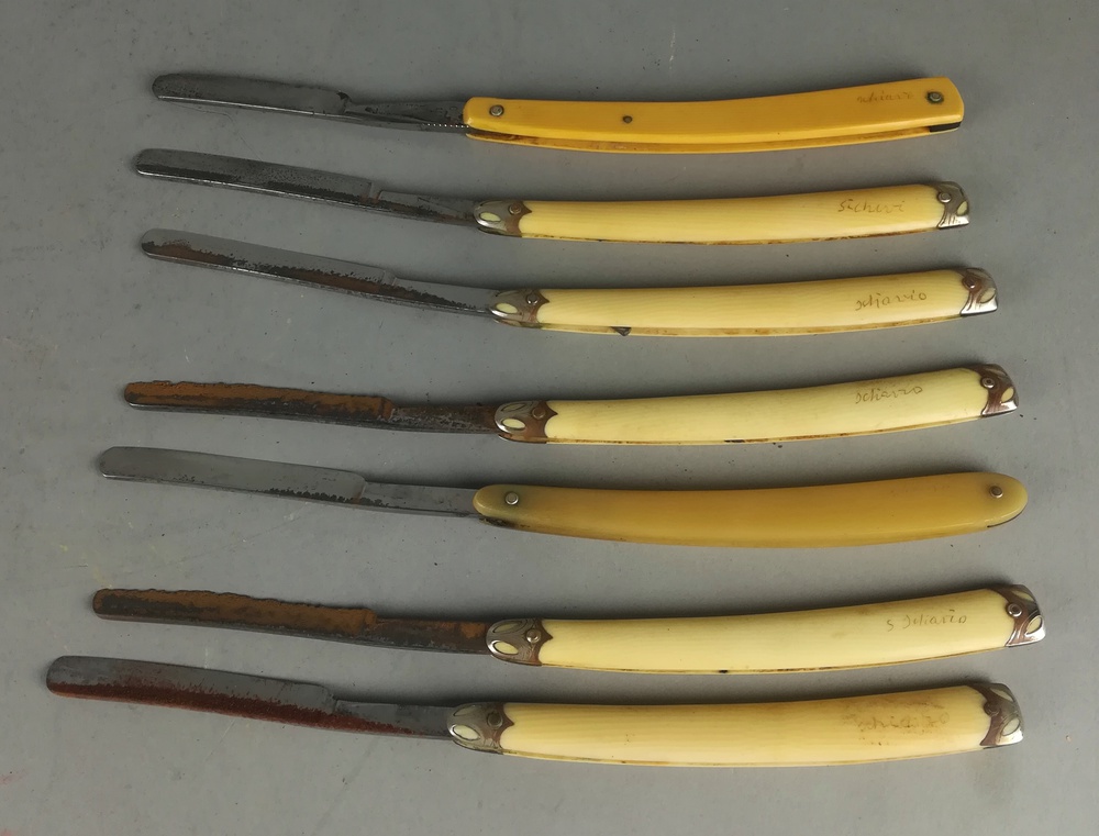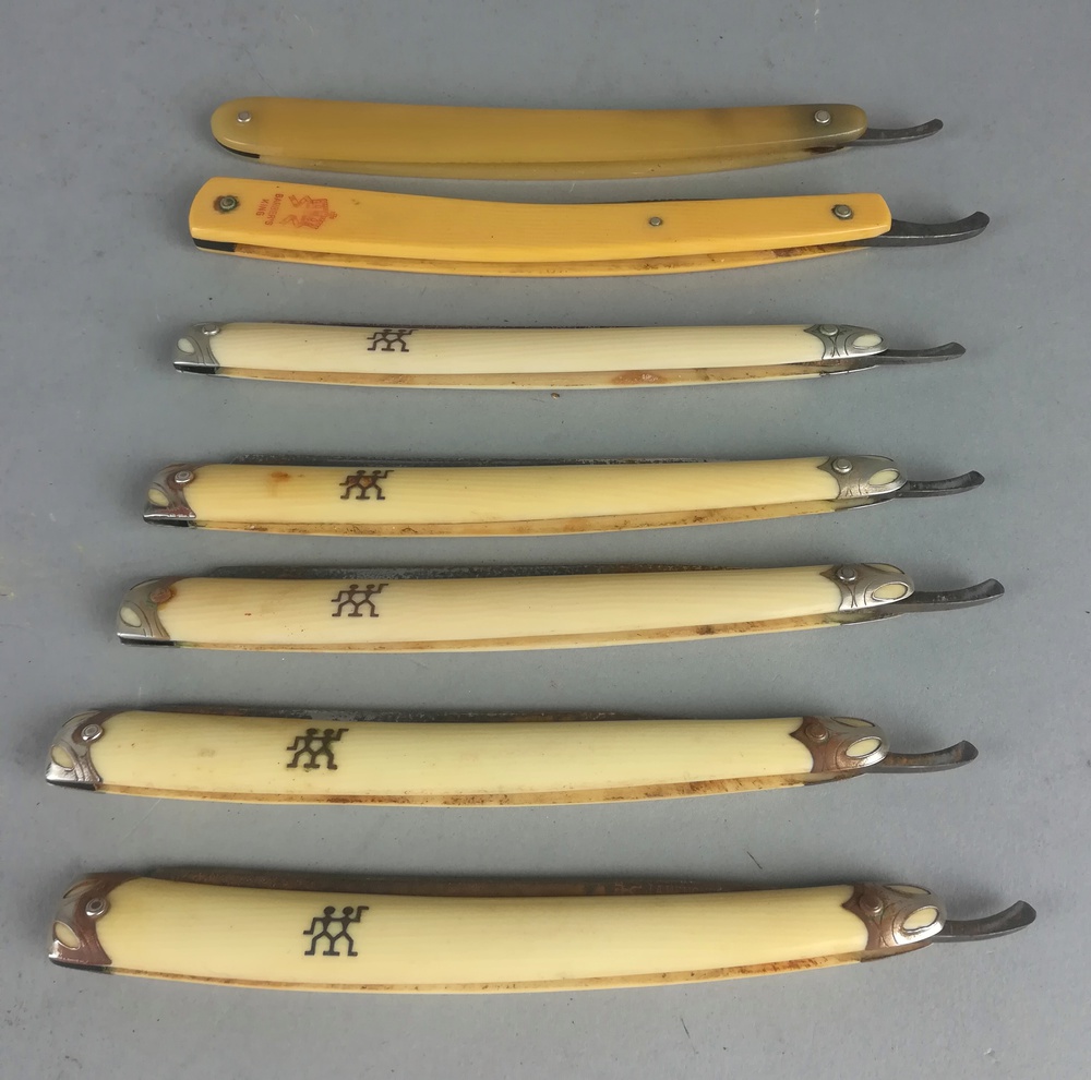 RASOIO Astuccio con sette rasoi con manici in osso. Sei marcati J.A. HENCKELS...