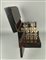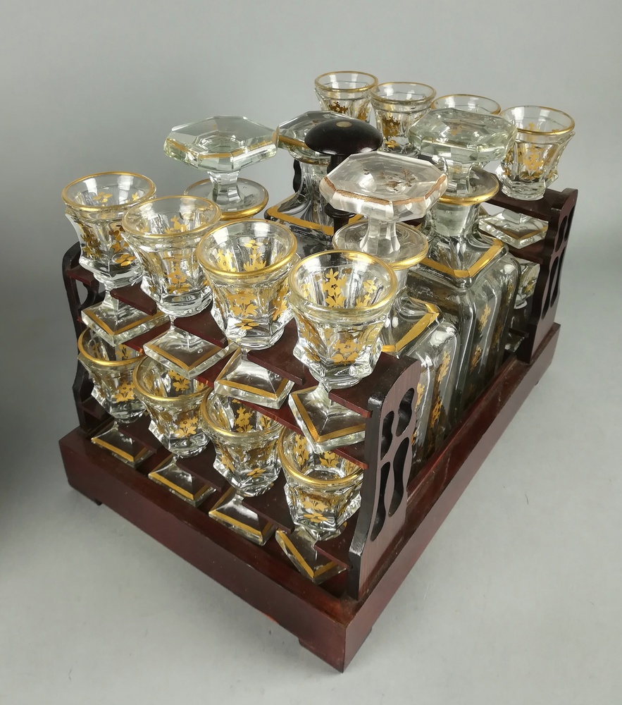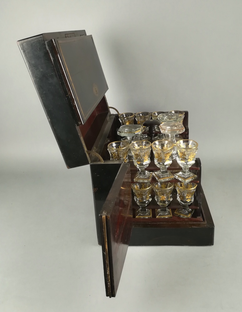 TANTALUS Tantalus in legno ebanizzato con finiture in ottone completo di quattro decanter e sedici bicchierini. Fine XIX secolo. cm 24,5x33x24