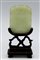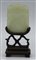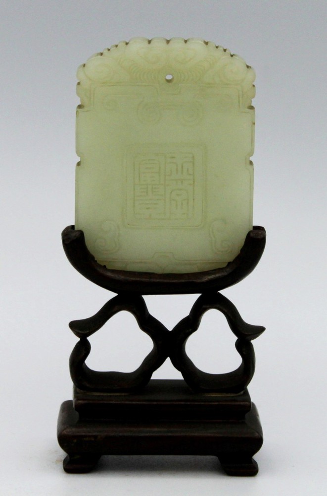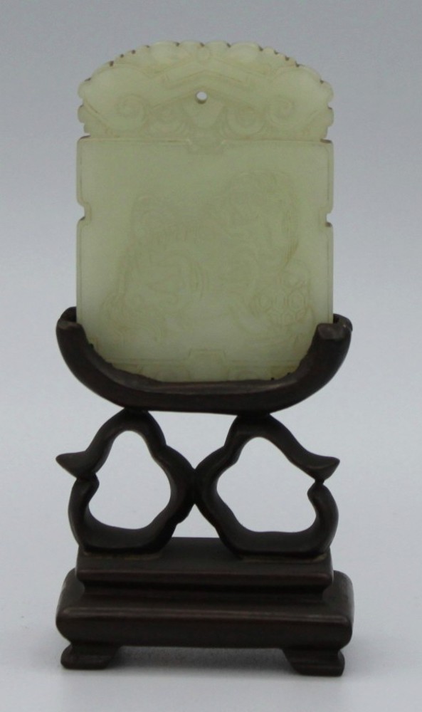 SCULTORE CINESE DEL XIX SEC. Placca in giada bianca finemente intagliata su base in legno. cm 6
