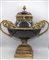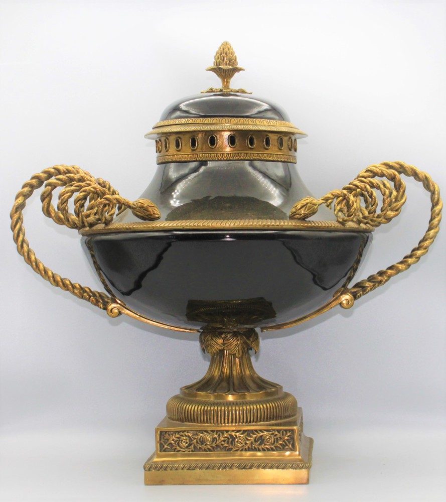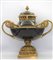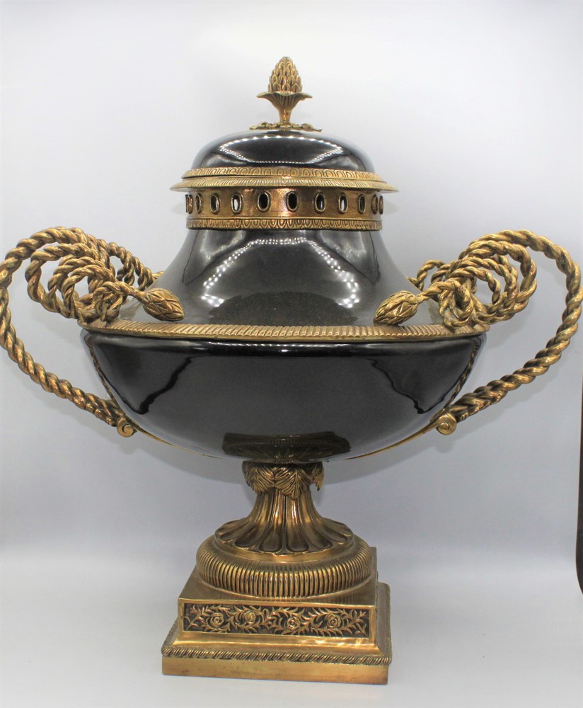 Lotto 317 | GRANDE CENTROTAVOLA biansato con coperchio. Ceramica blu con basamento bronzo...