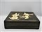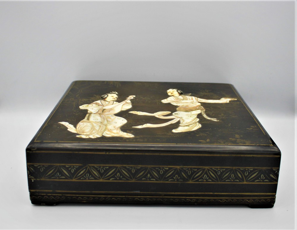 SCATOLA in legno laccato arricchita sul coperchio con figure in madreperla e...