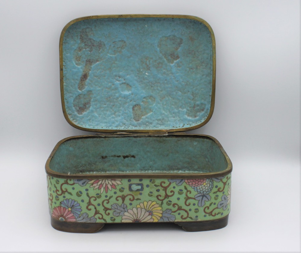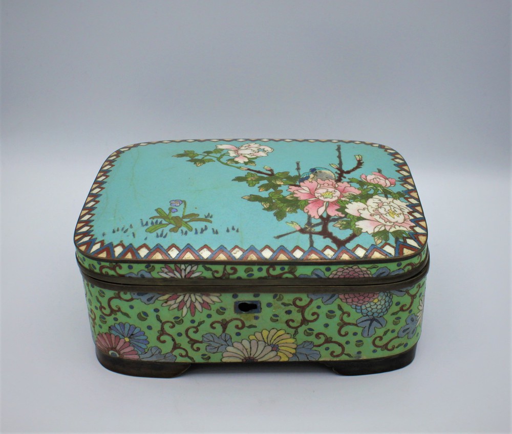 SCATOLA in smalto cloisonné decorata con motivi floreali. Cina inizi XX sec....