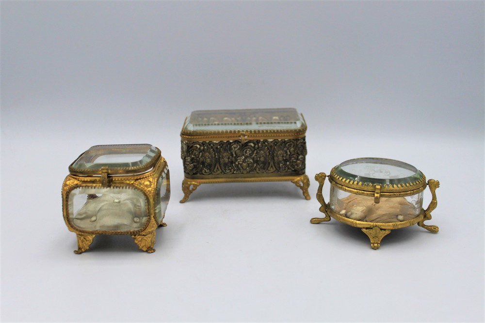 TRE SCATOLE porta gioie in vetro metallo dorato. Francia inzi XX sec. mis. Varie