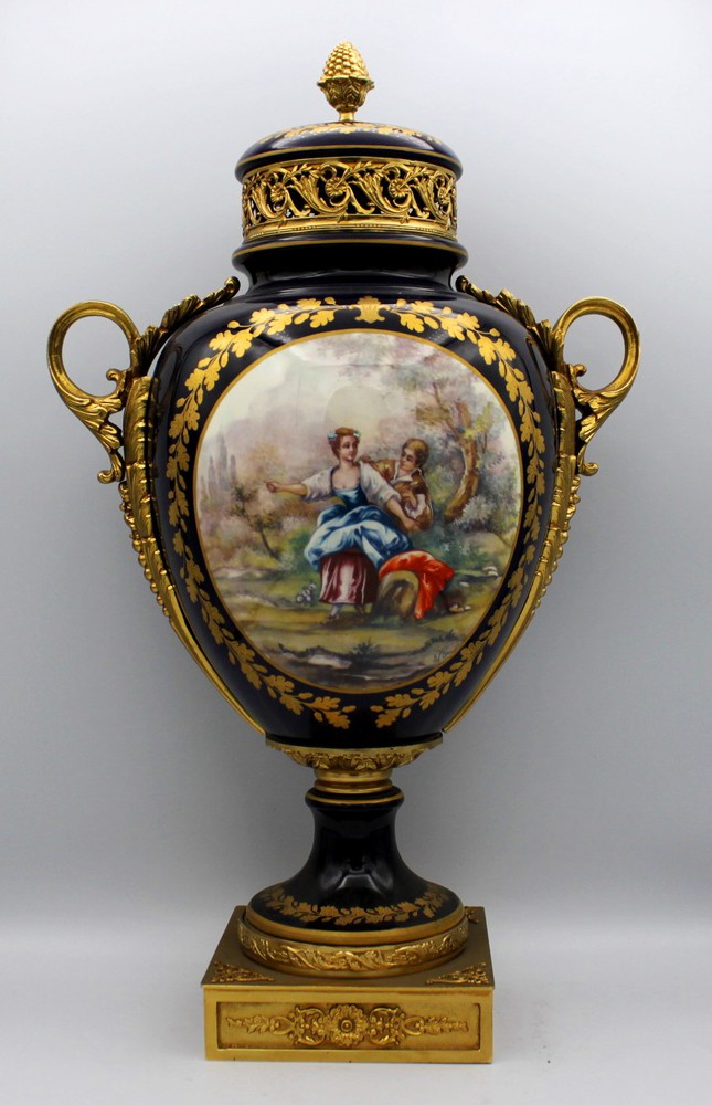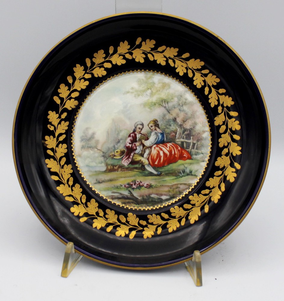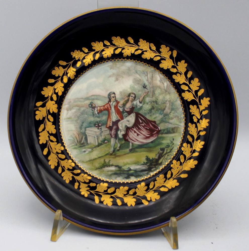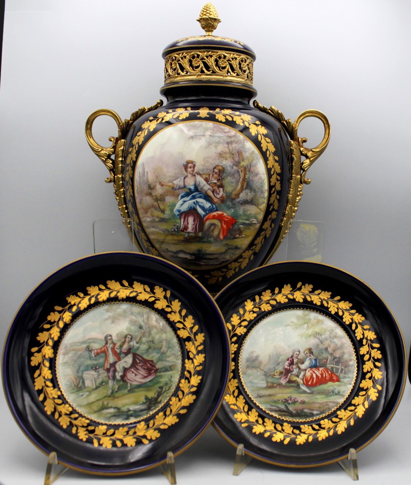 Lotto 334 | MANIFATTURA DI SEVRES Un vaso e due piatti in porcellana blu cobalto decorati...